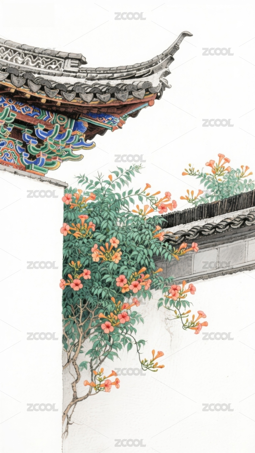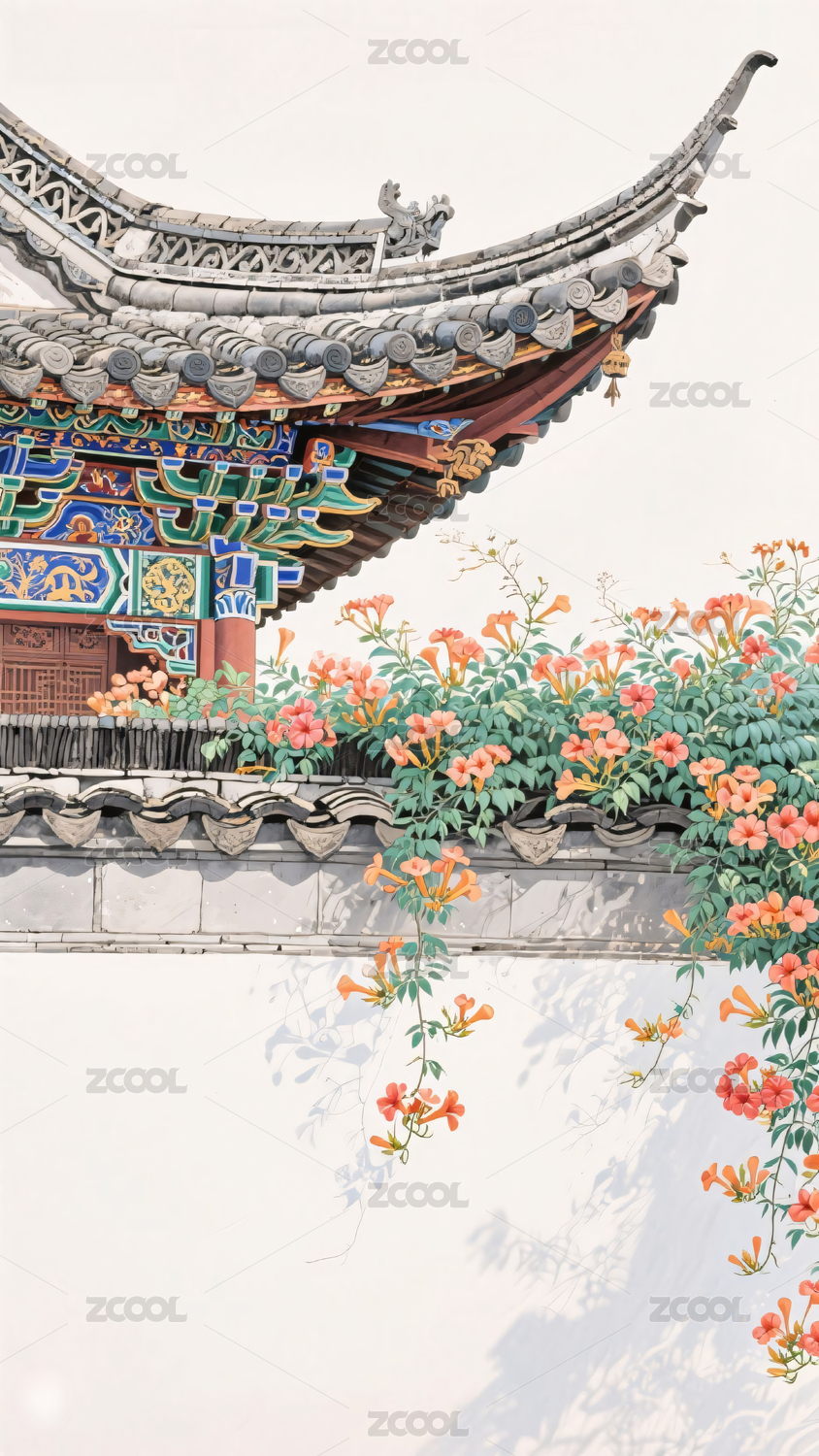 古建飞檐白墙黛瓦凌霄花