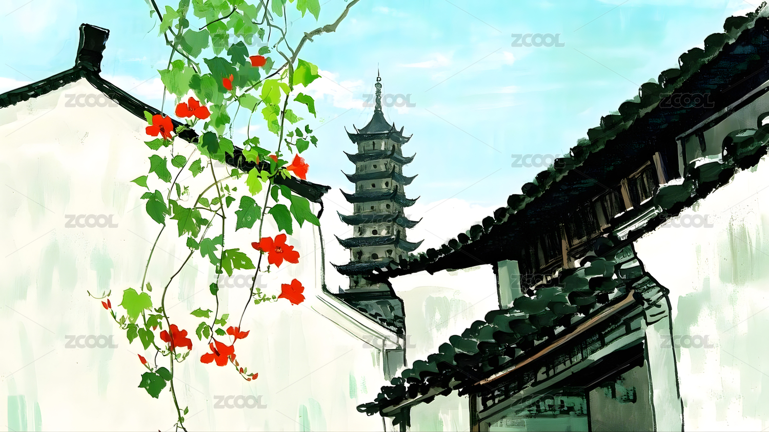 古塔红花白墙灰瓦水墨画