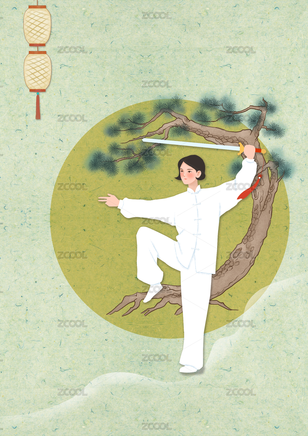 国风女子舞剑劲松灯笼图