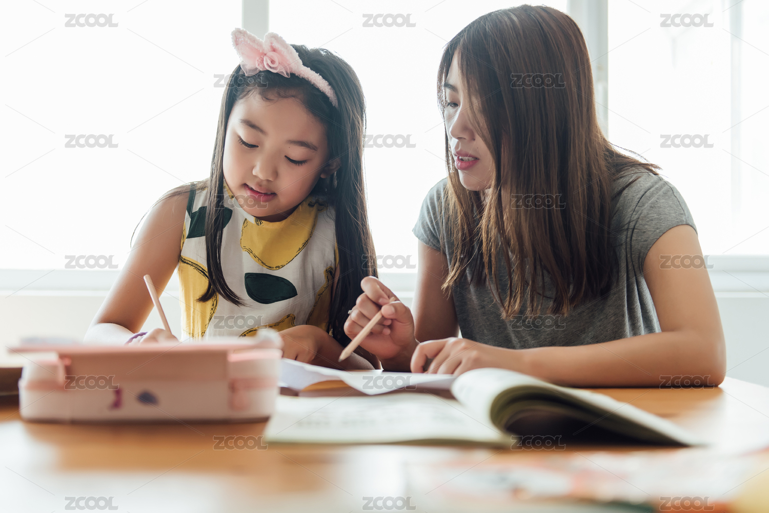 漂亮在家自学妈妈高兴教学聪明的女儿在全球私人的经验教训。亚洲认真女童触摸地图和好奇观望。