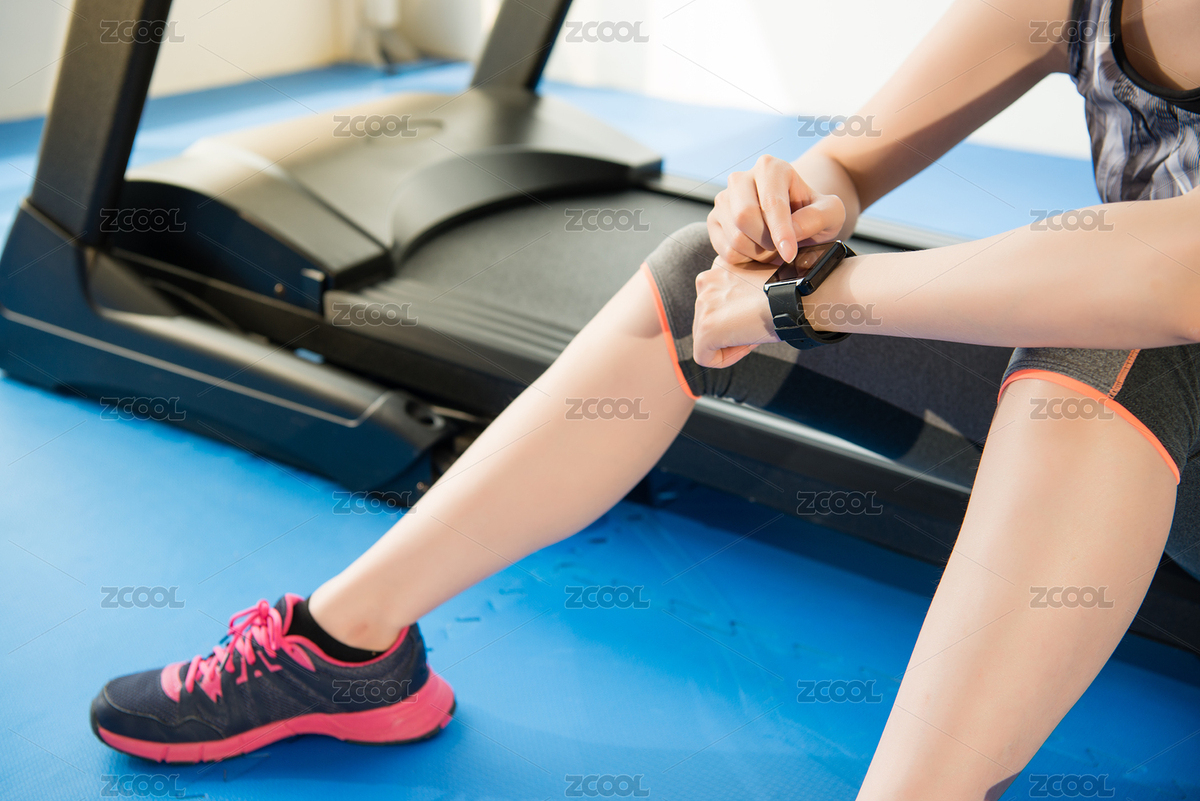 亚洲女子坐在休息跑步机上使用的SmartWatch检查脉搏。室内健身房背景。健康运动理念