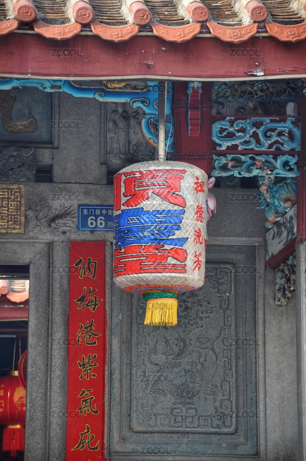 中国传统古建筑屋檐屋顶和悬挂的红灯笼