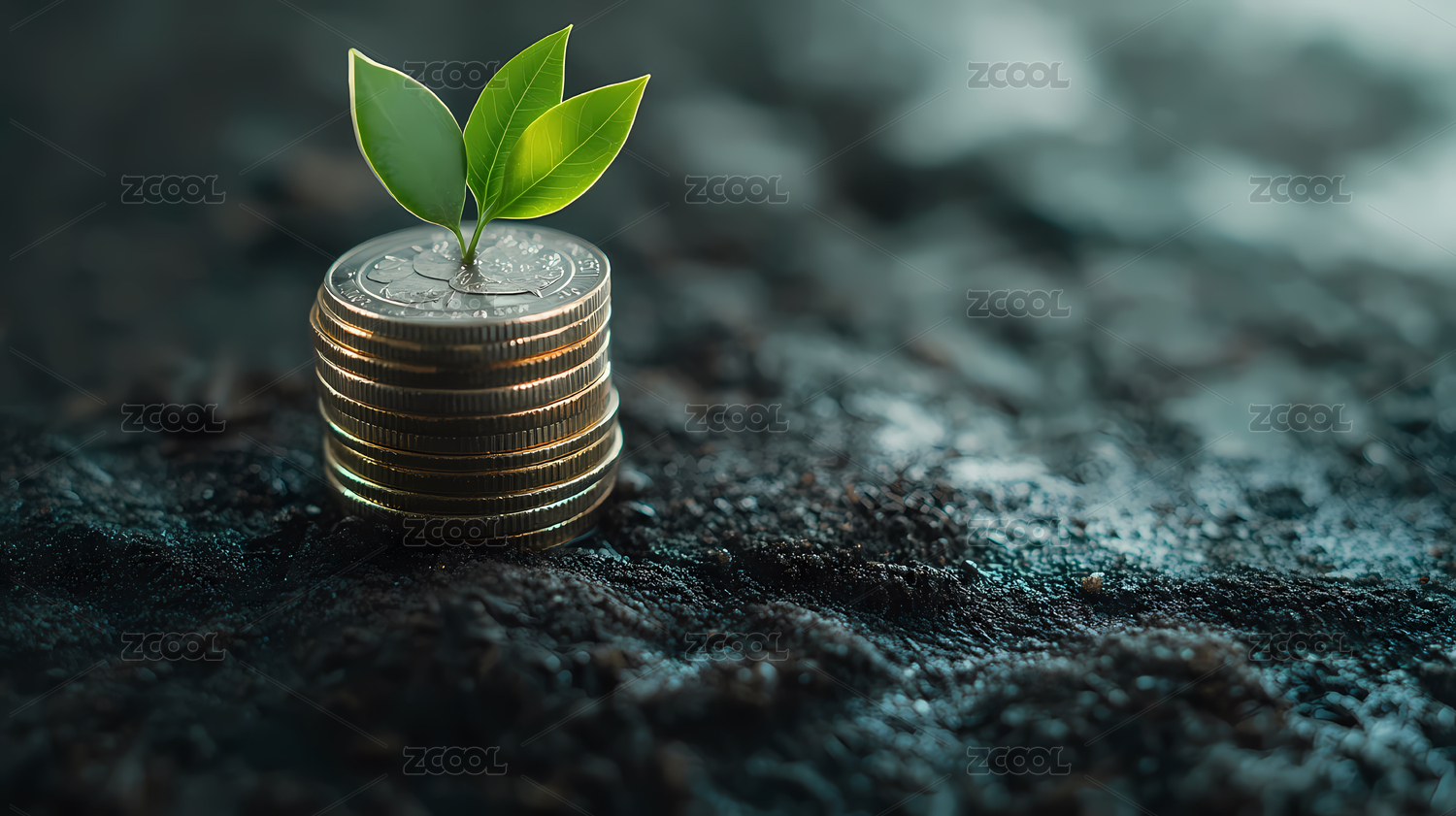简约,金币,货币,金色,黄金,硬币,堆叠,植物,绿叶,绿色