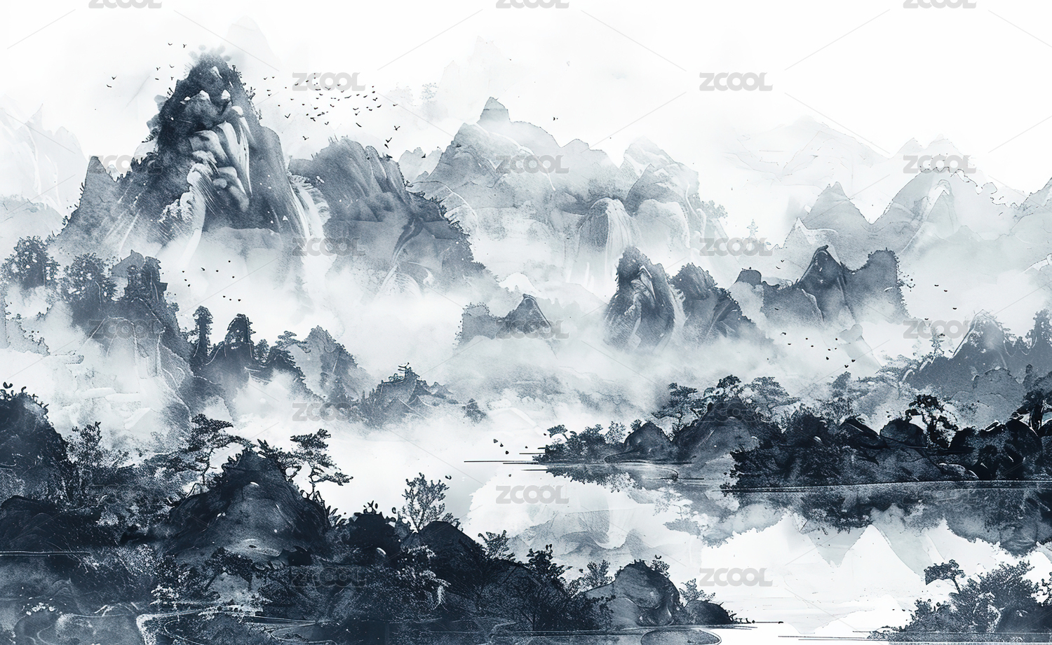 中国风水墨风格山水云雾图景