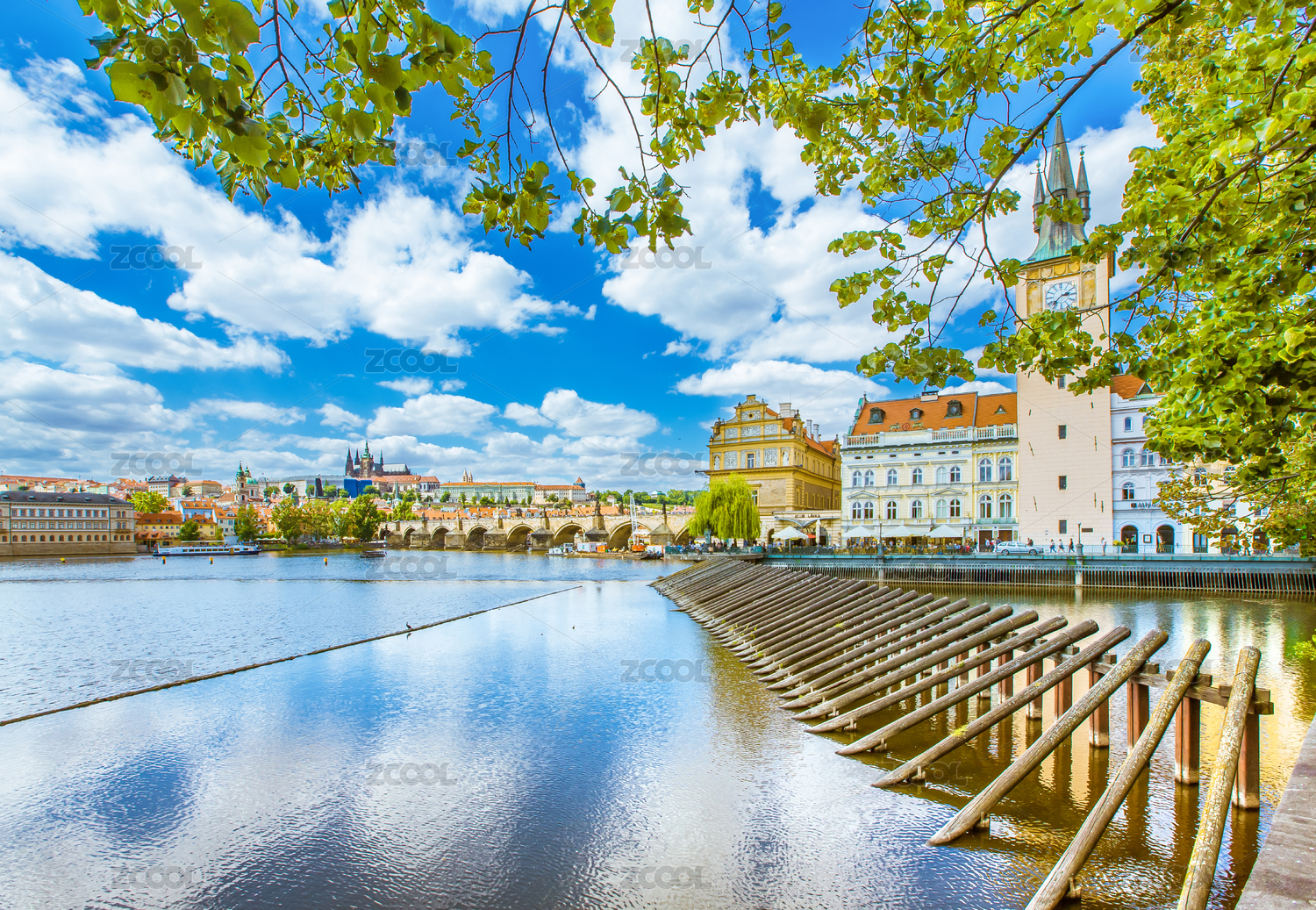 捷克布拉格市伏尔塔瓦河查理大桥附近的风光