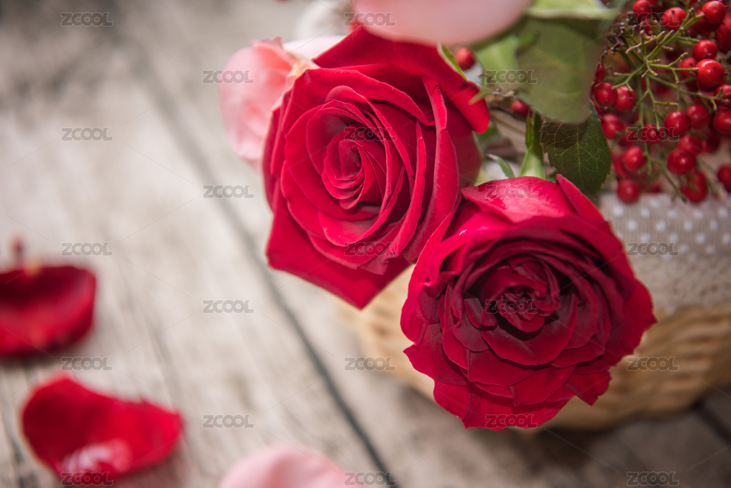 灰蓝色的木头桌面上,放着两支红色玫瑰