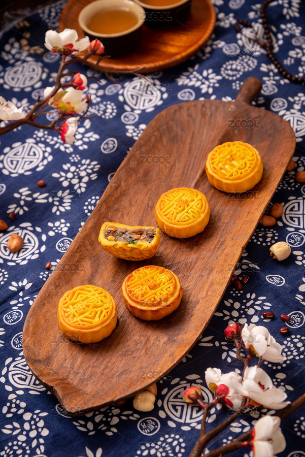 一盘中秋月饼放在中式场景的木质感的桌面上