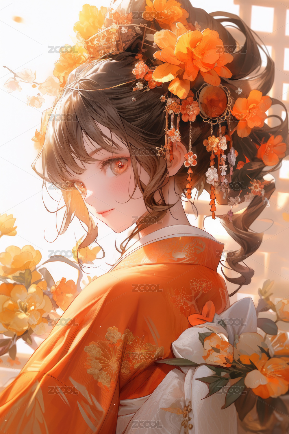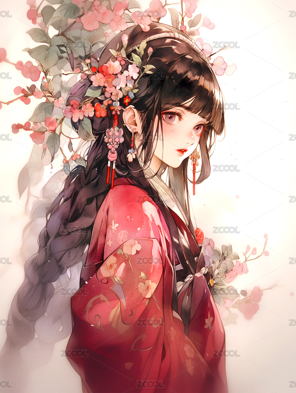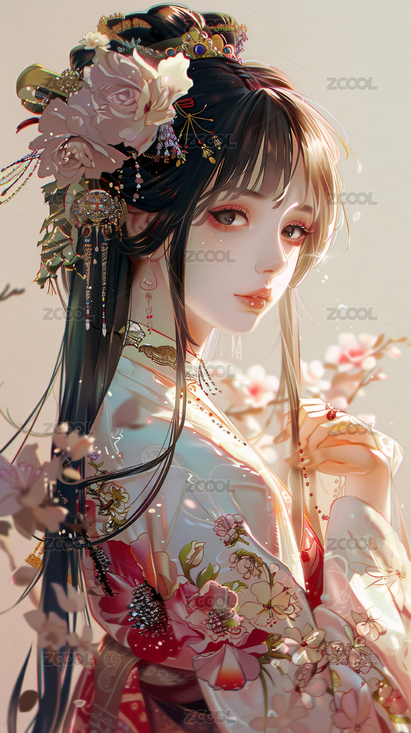头戴精美发饰的古风日式和服少女侧脸