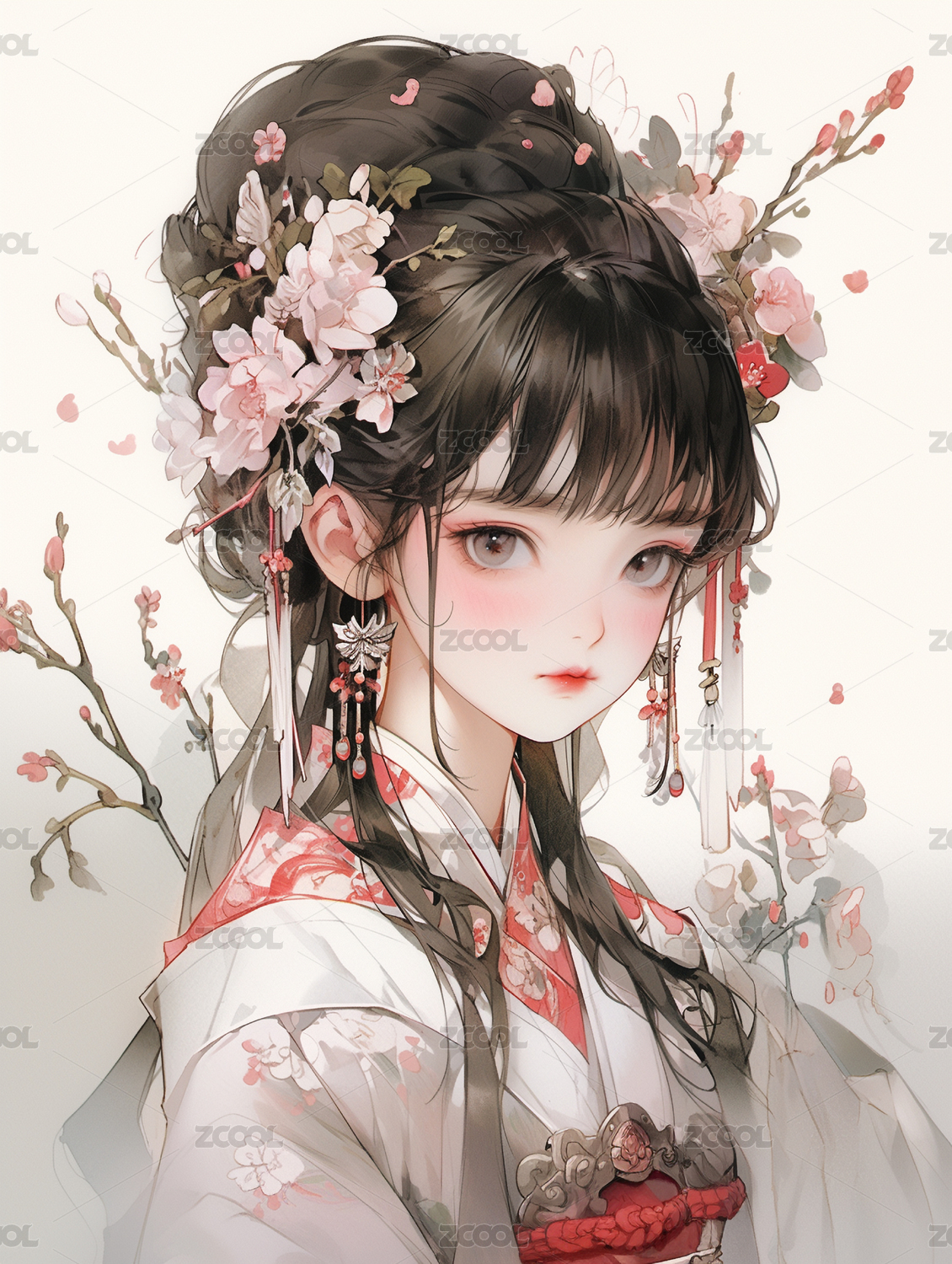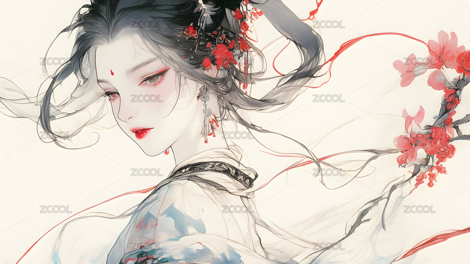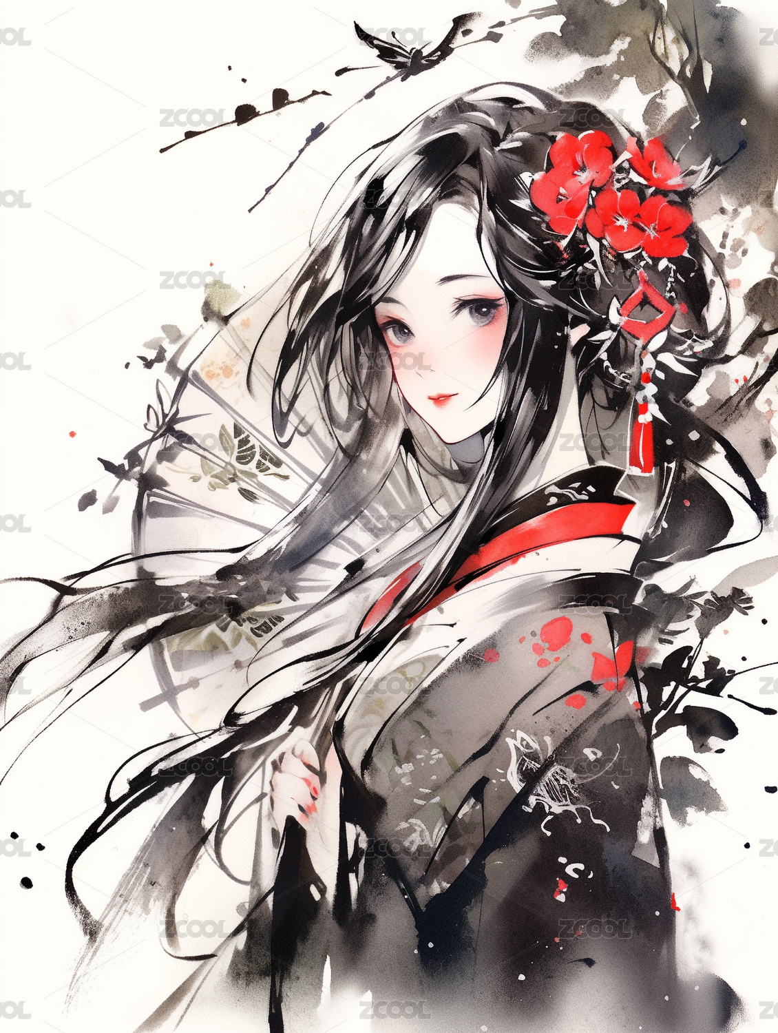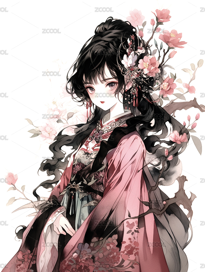手绘唯美的水墨古装漂亮的女孩插画