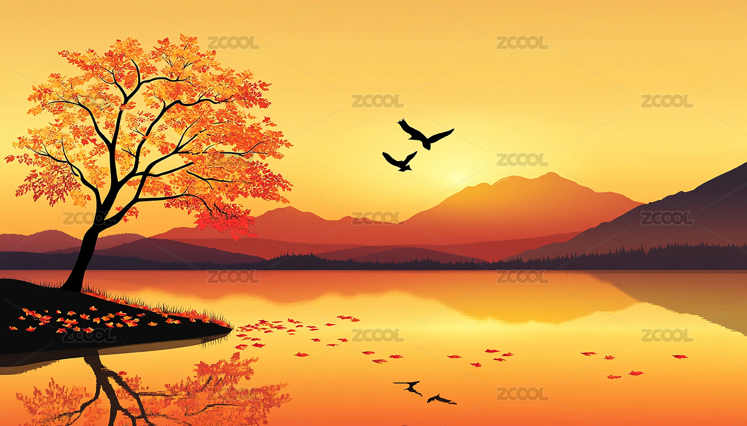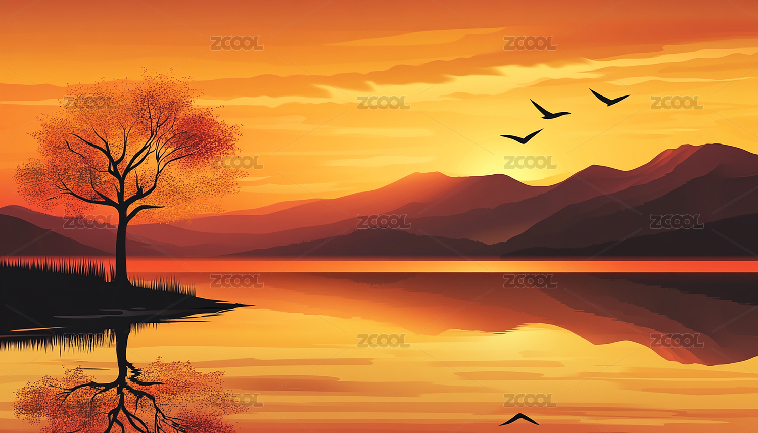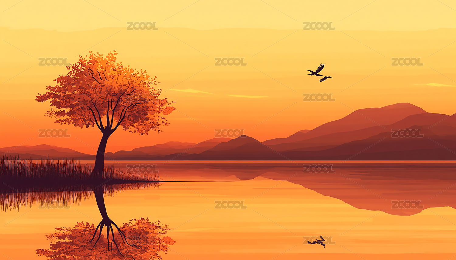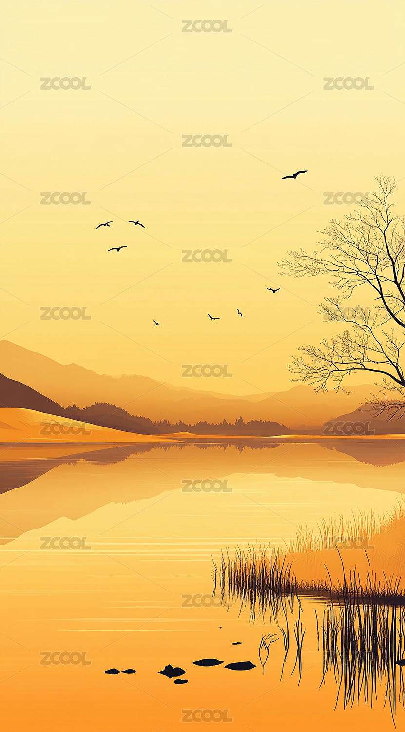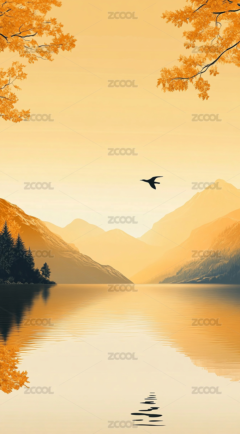 水天,金色,扁平风,飞鸟,湖面,湖水,群山