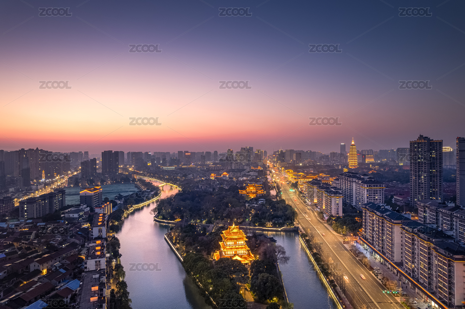 中国湖南省长沙杜甫江阁夜景航拍风光