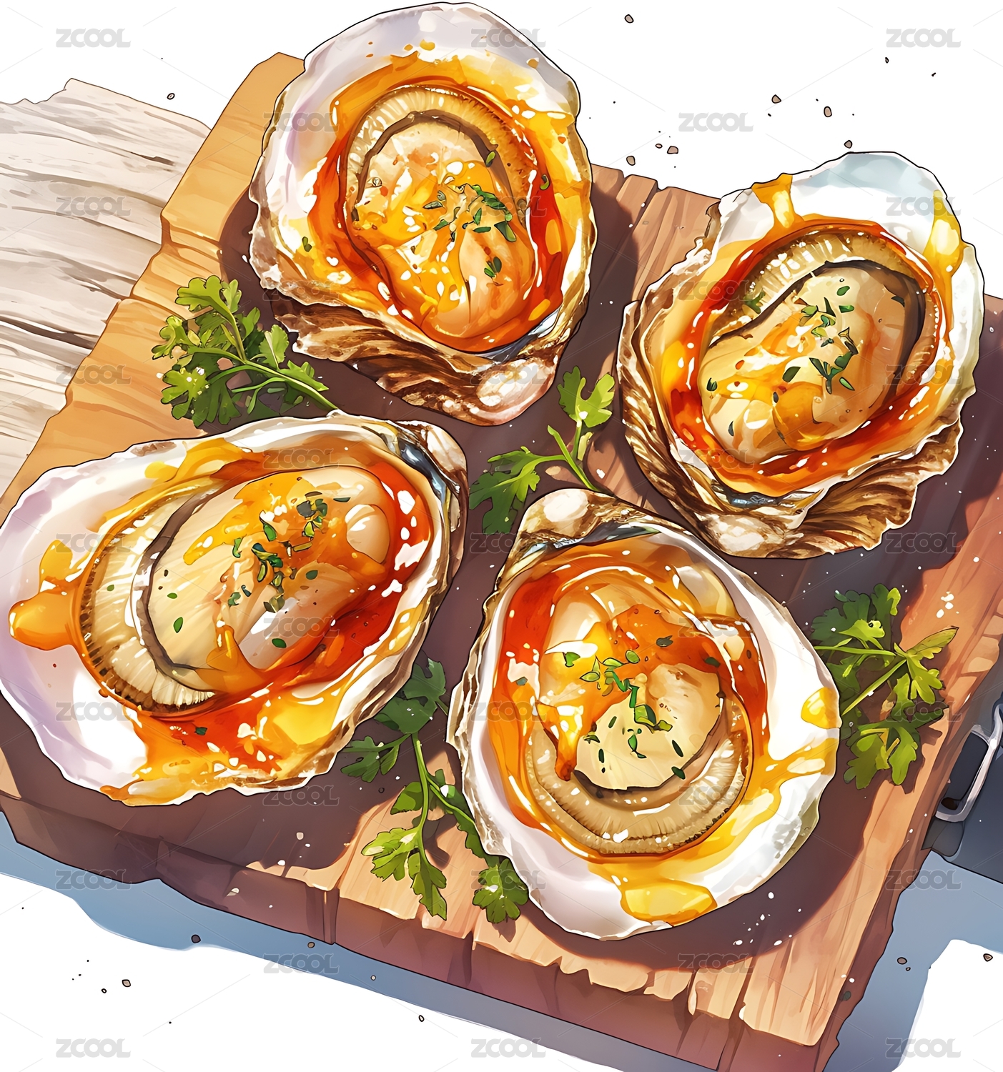 两个美味的扇贝海鲜水彩插画