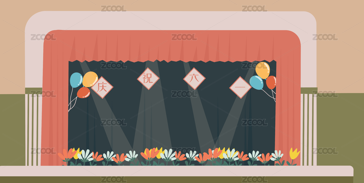 剧场舞台背景鲜花气球扁平矢量插画横版有字