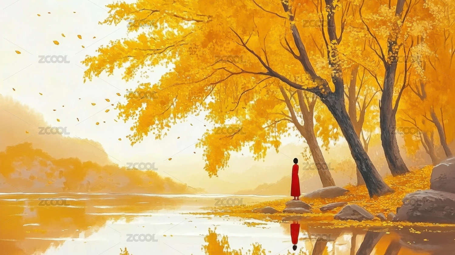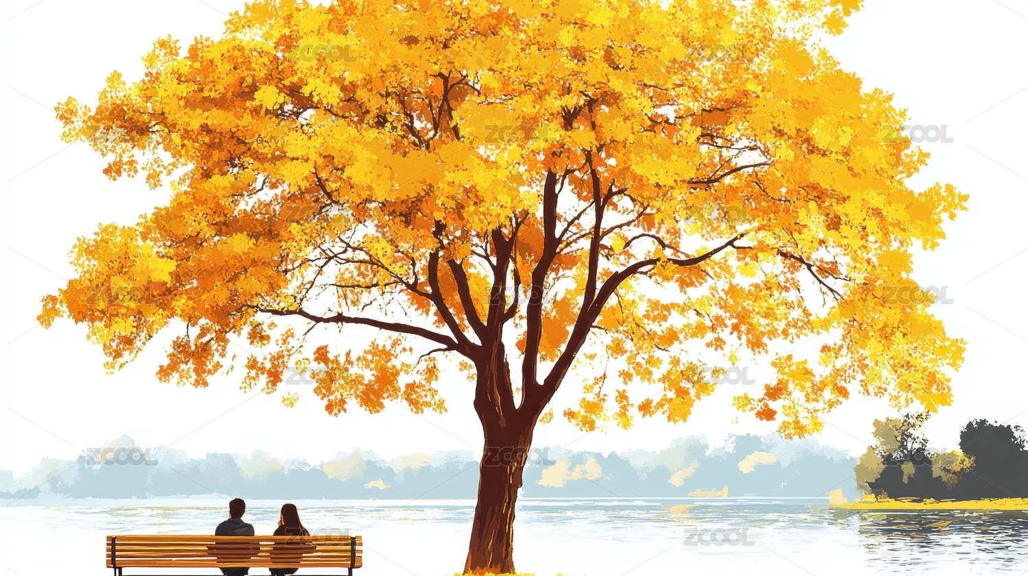 秋日湖畔行人与金黄树木