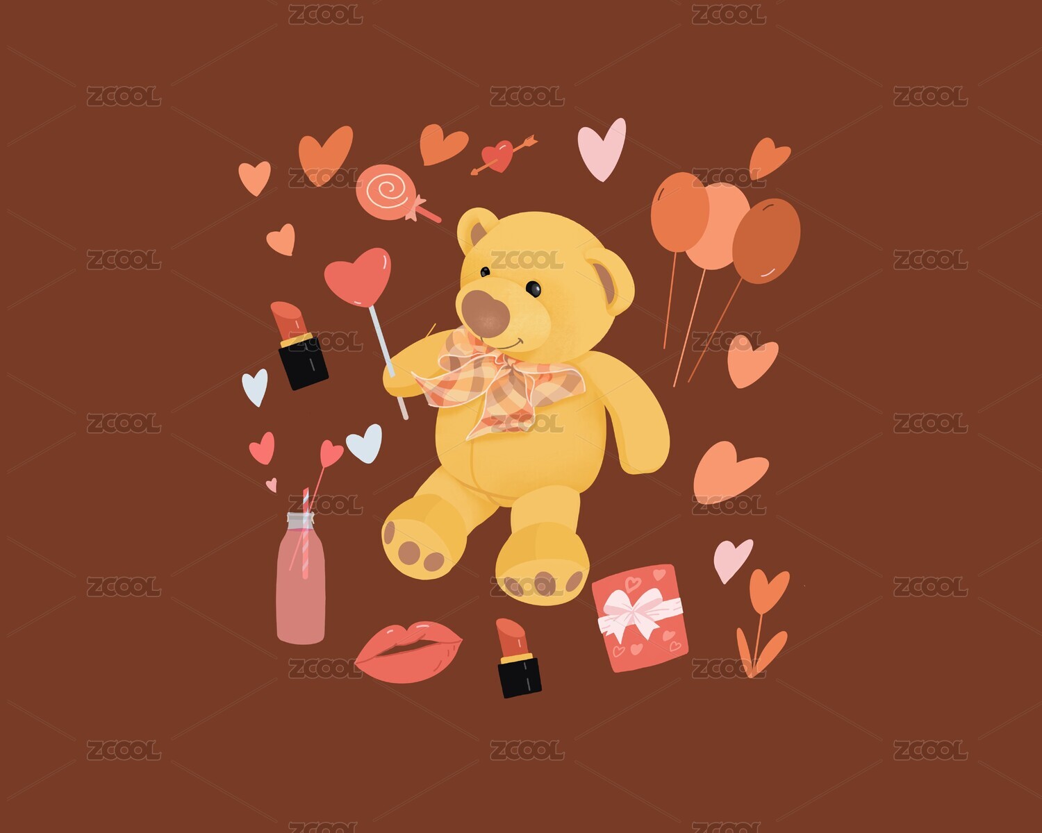 深红色背景下被爱心气球等浪漫图案围绕的可爱小熊