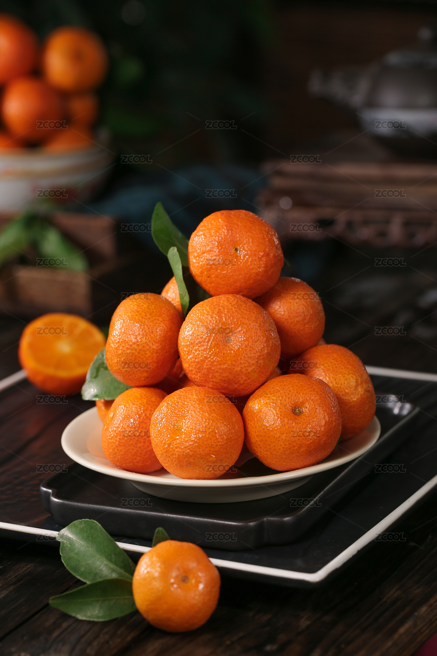 中式复古场景中放在木盘上的一堆新鲜砂糖桔