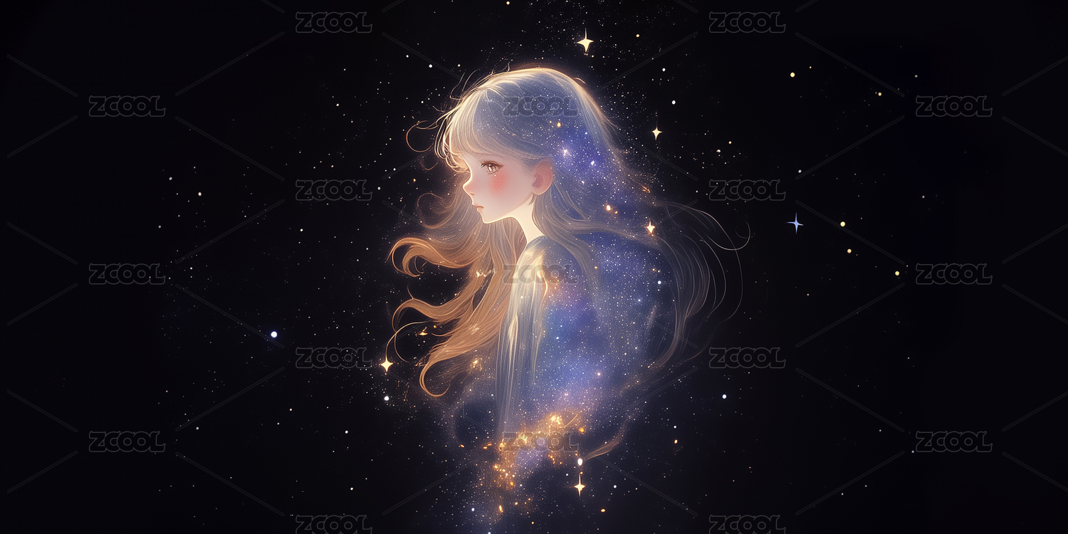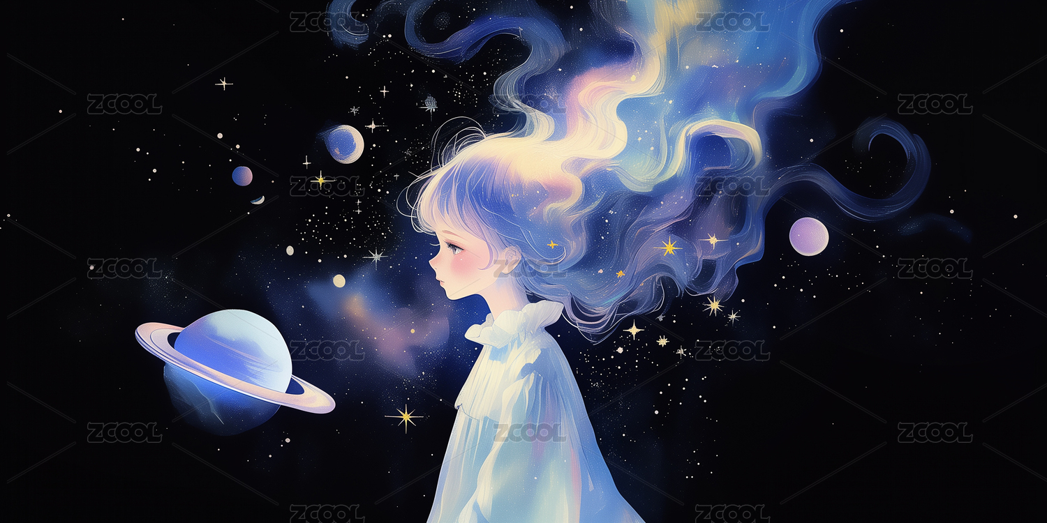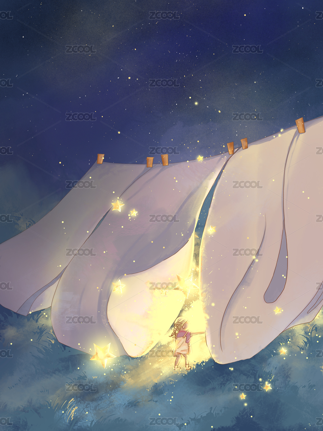 纯白少女放飞手中的星星,深蓝色治愈星空