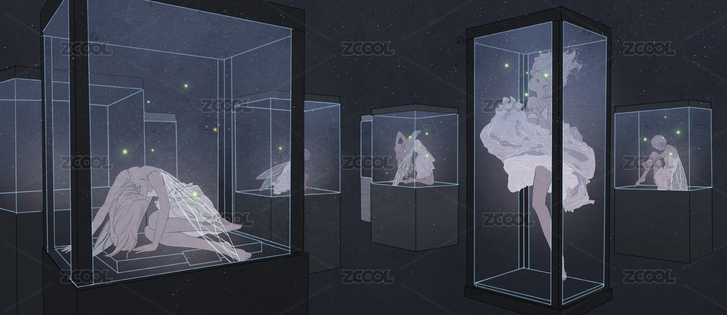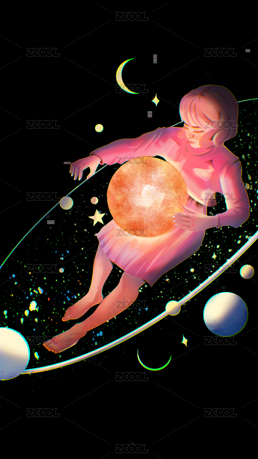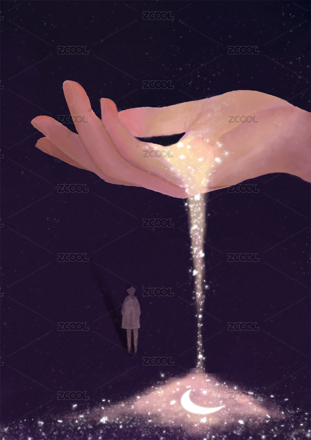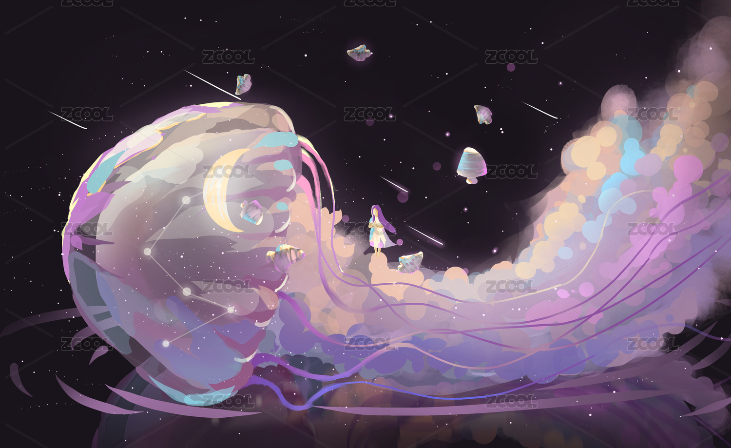纯白少女放飞手中的星星,深蓝色治愈星空