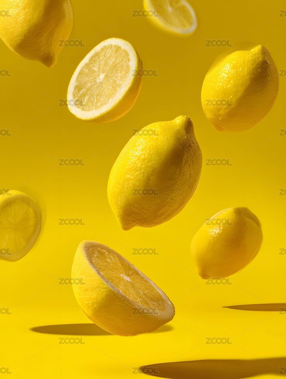 黄色背景下飞舞的柠檬及切片