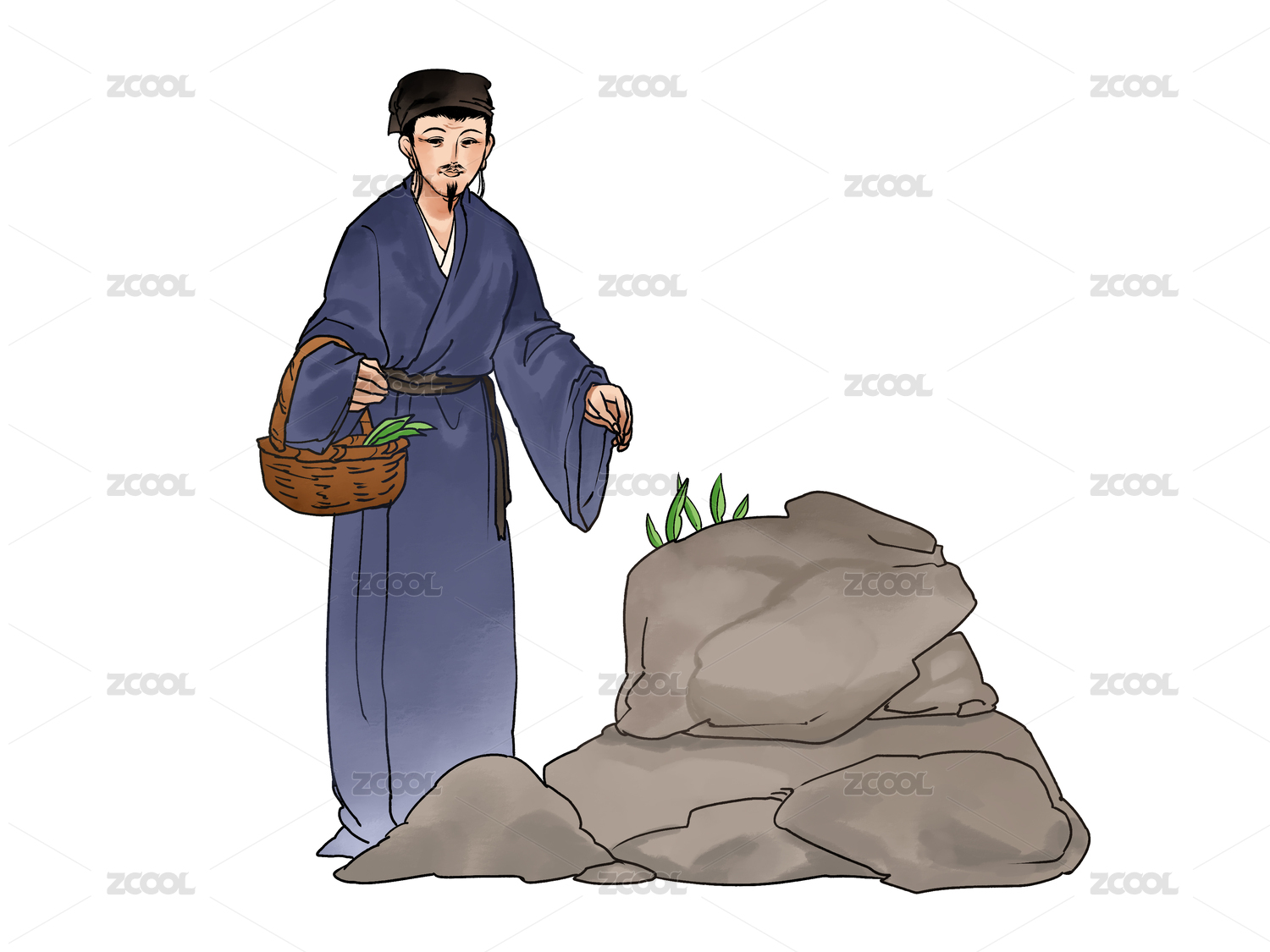 蓝色古风摸胡子拿竹子拐杖采药背药篓水