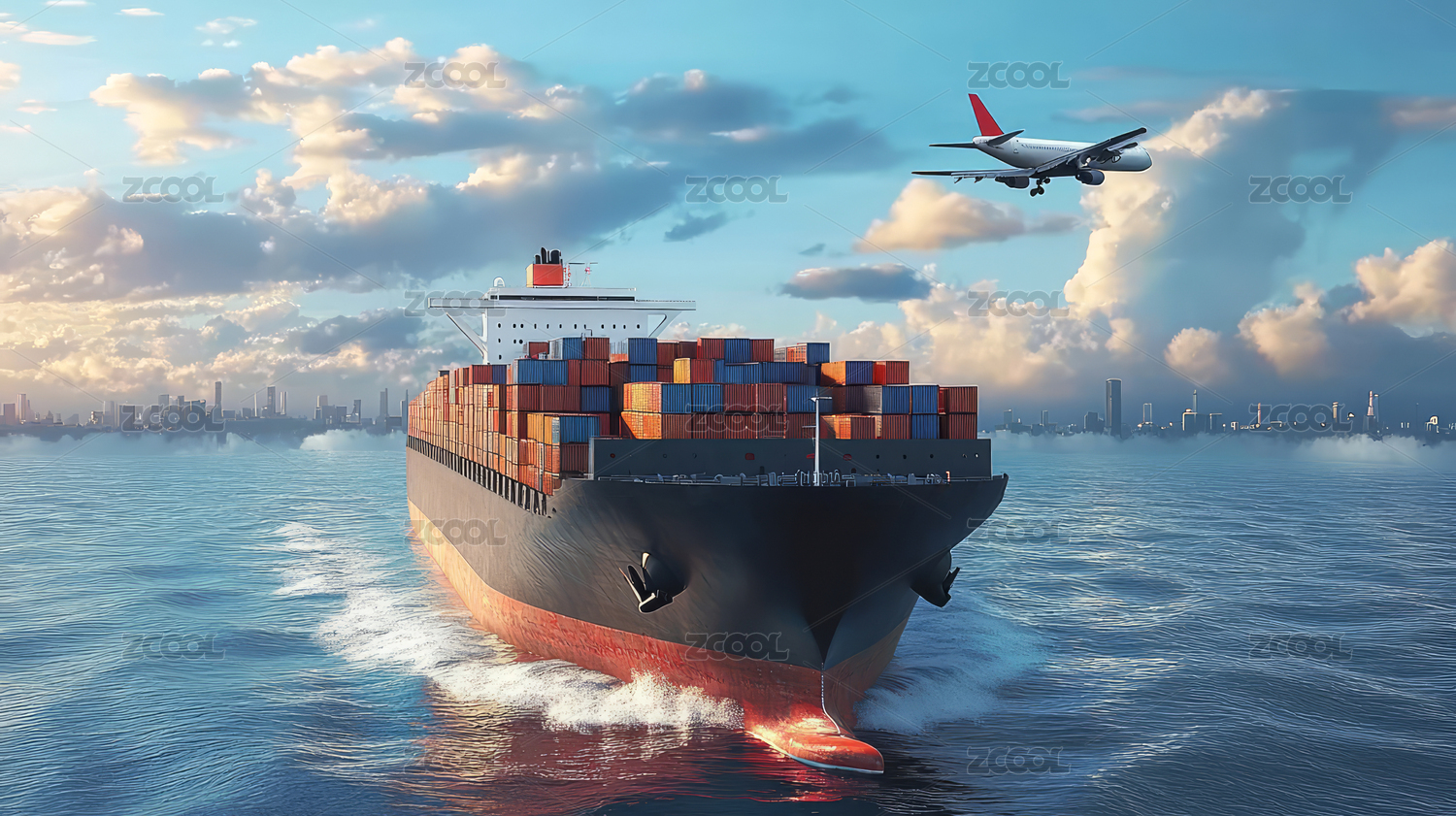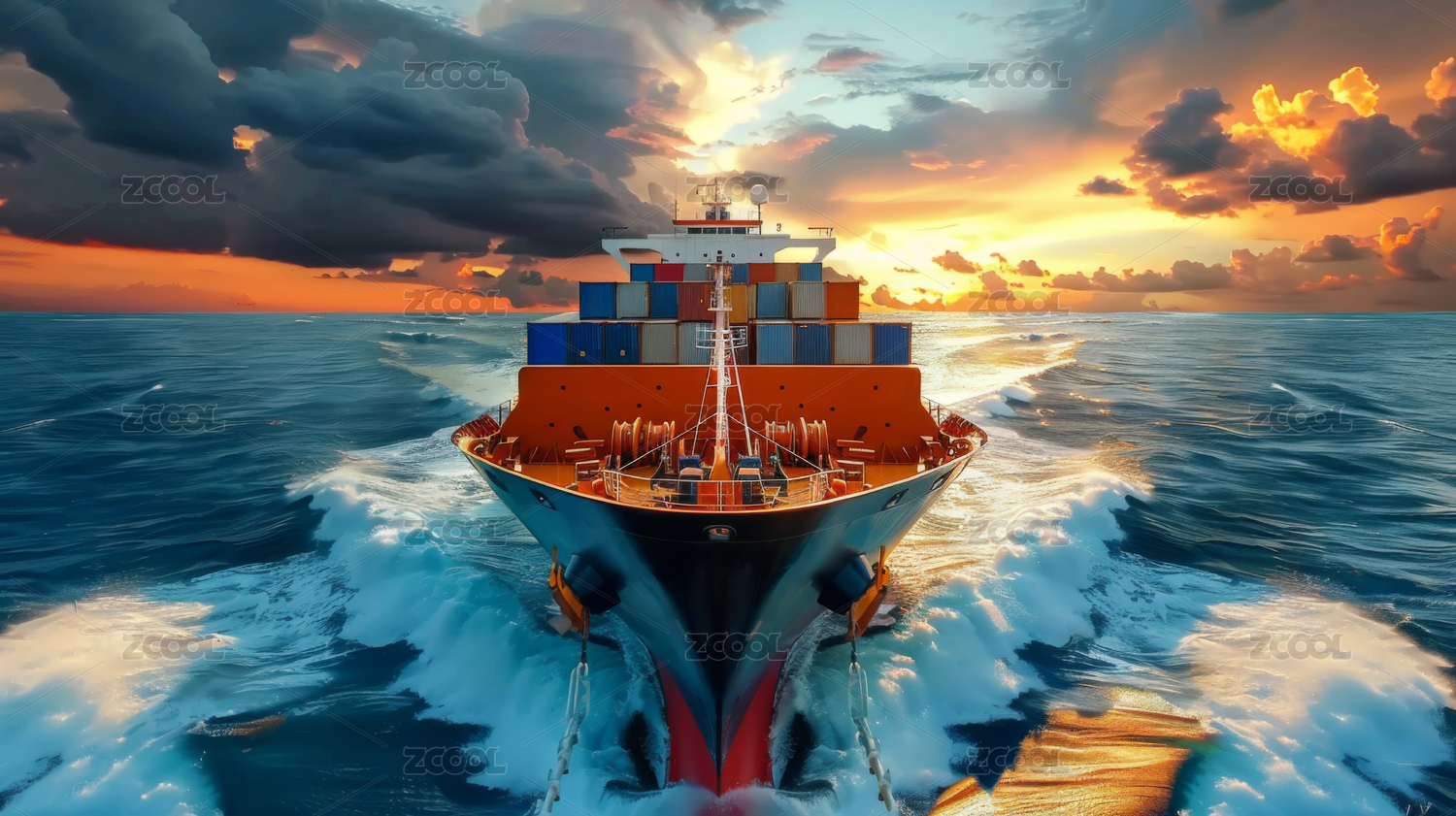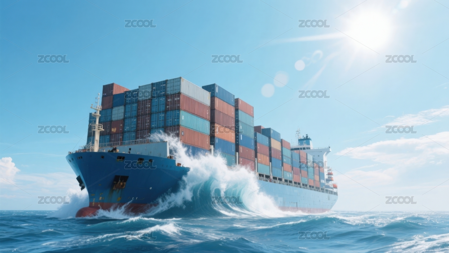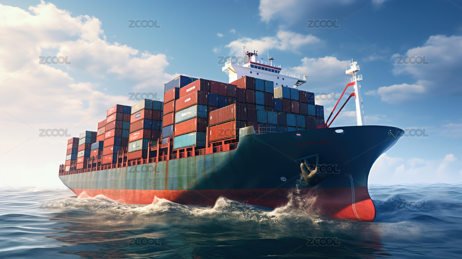 满载彩色集装箱货轮航行于蔚蓝海洋
