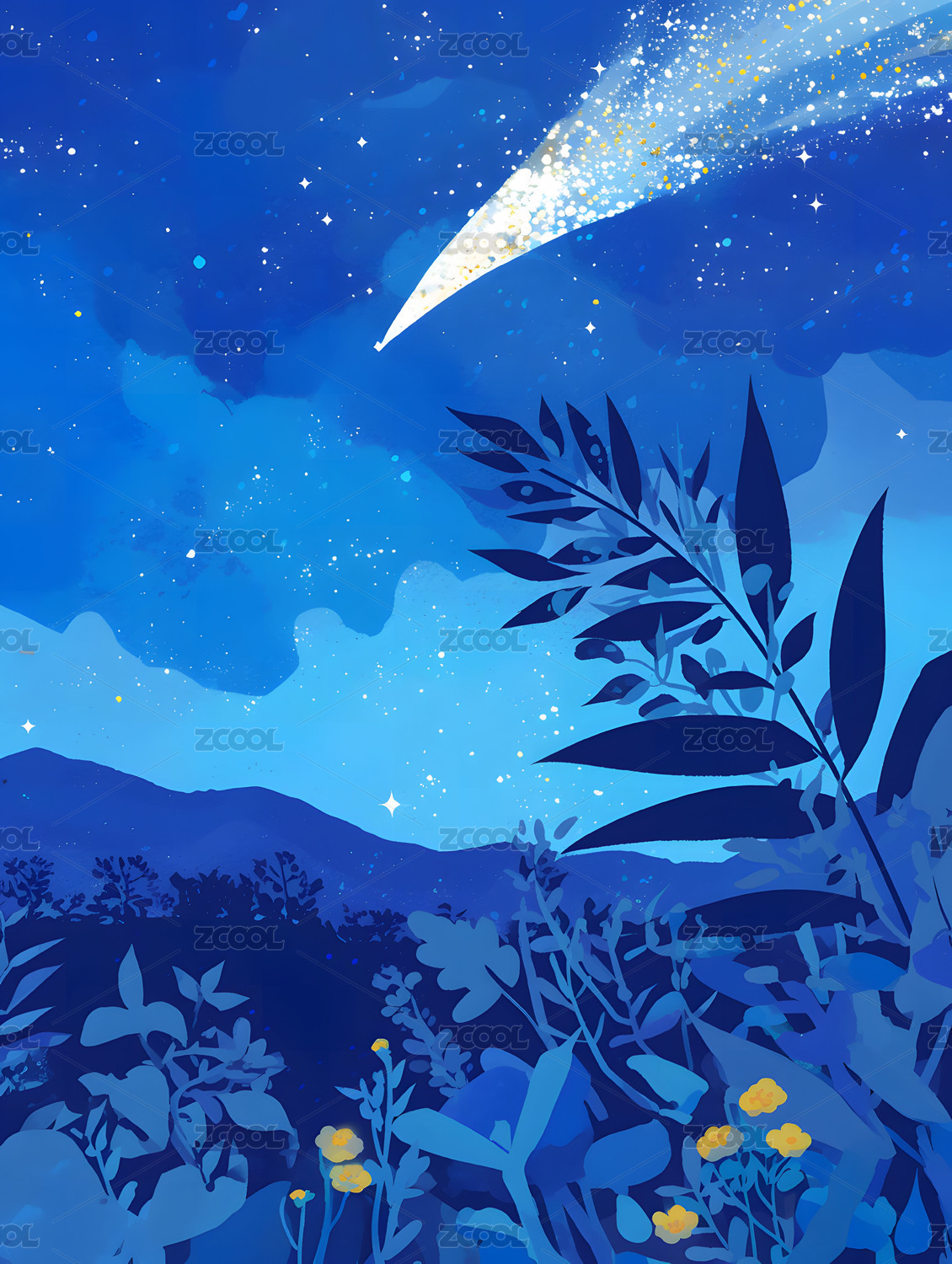 夜空中掉落的星球梦幻场景插画