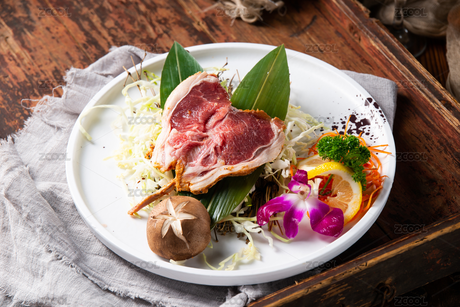 蓝色瓷盘里的酱牛肉切片与蔬菜摆盘