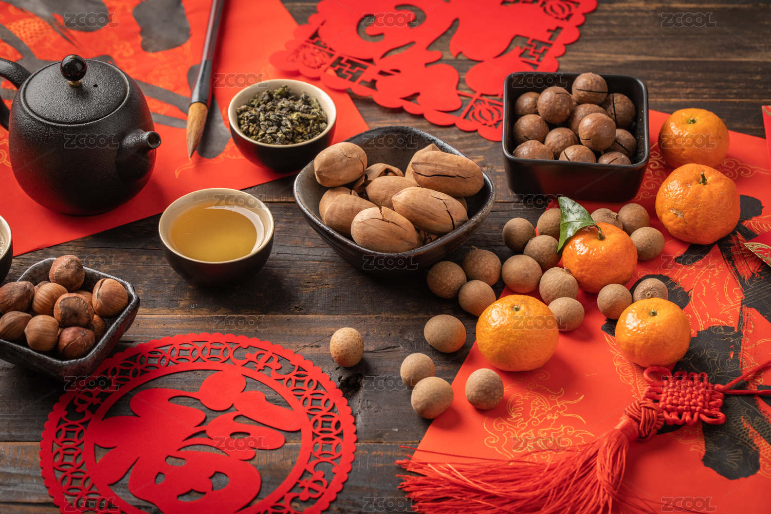 摆在红色背景上茶具套装和装有坚果果盒及对联
