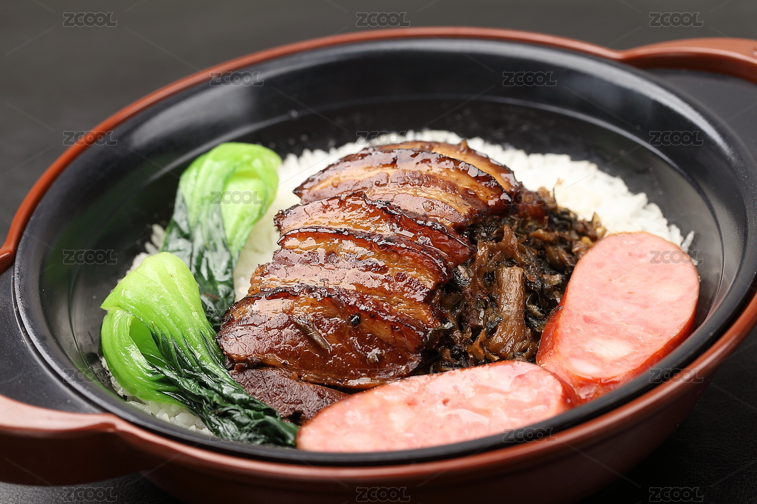 梅干菜煲仔饭,煲仔饭,梅干菜,青菜,小青菜,火腿肠,梅菜,咸菜,梅干菜蒸肉,烧白