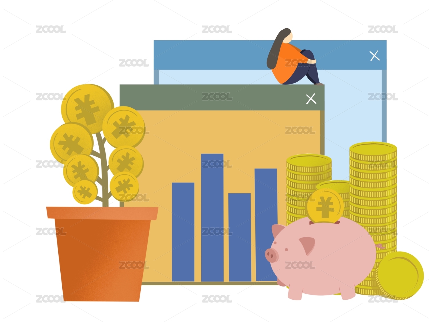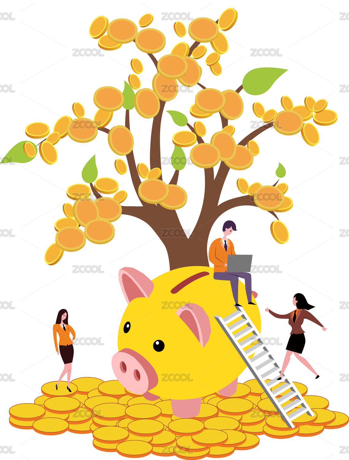 金融理财概念商务插画,职员在储蓄罐钱堆砌金币