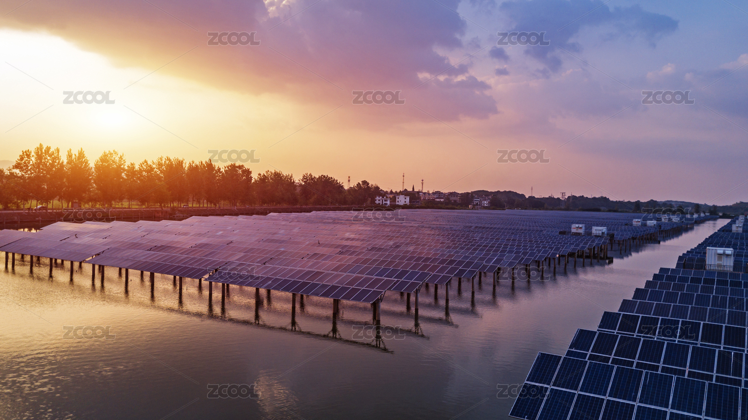 日落时湖面上排列整齐的太阳能电池板