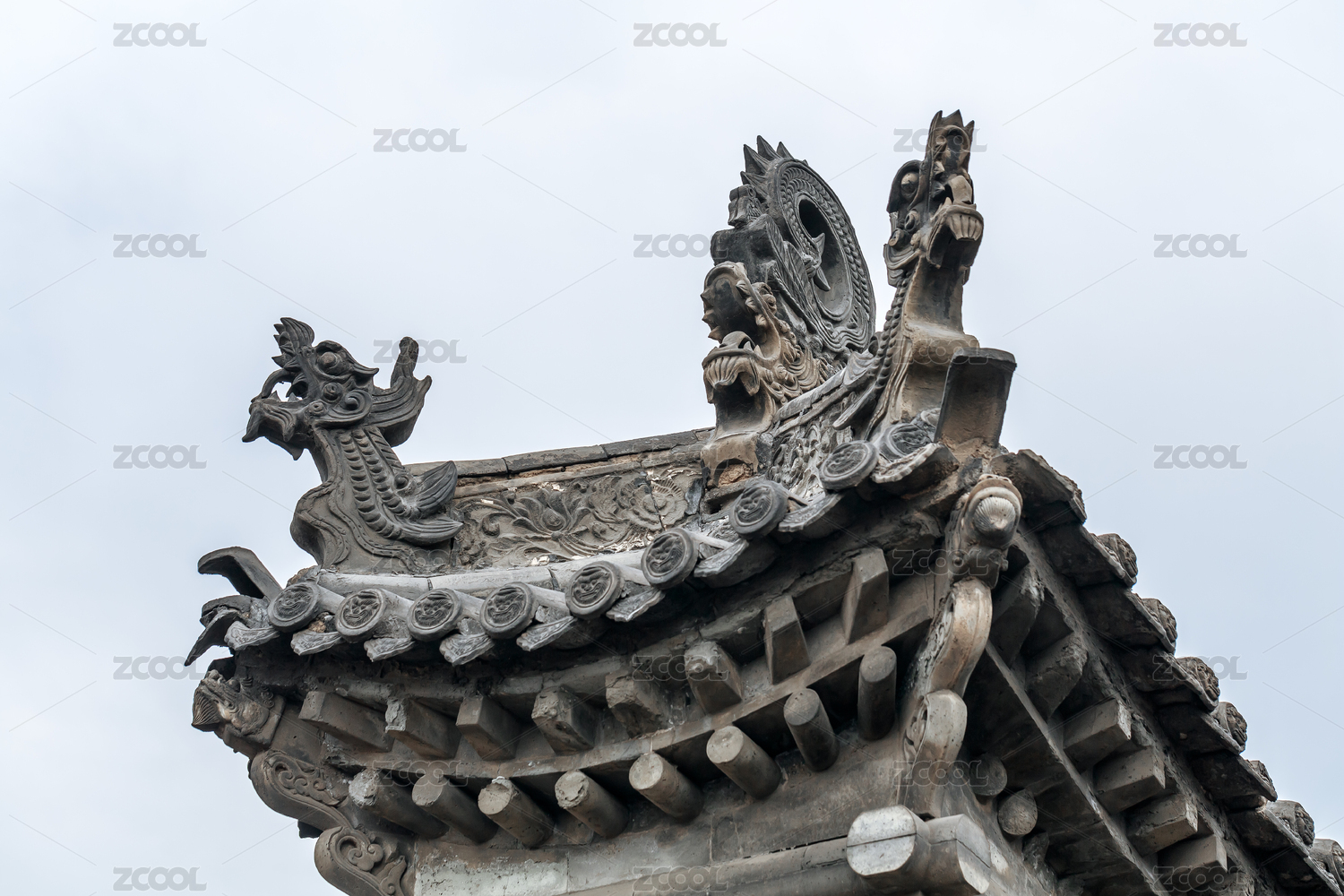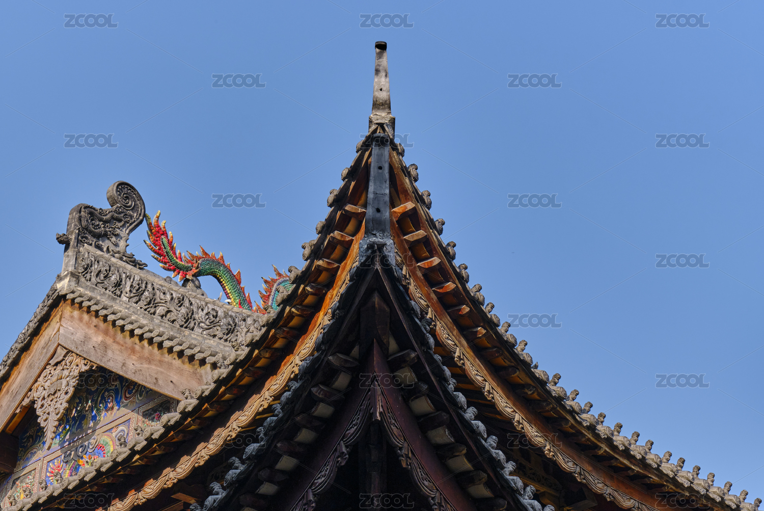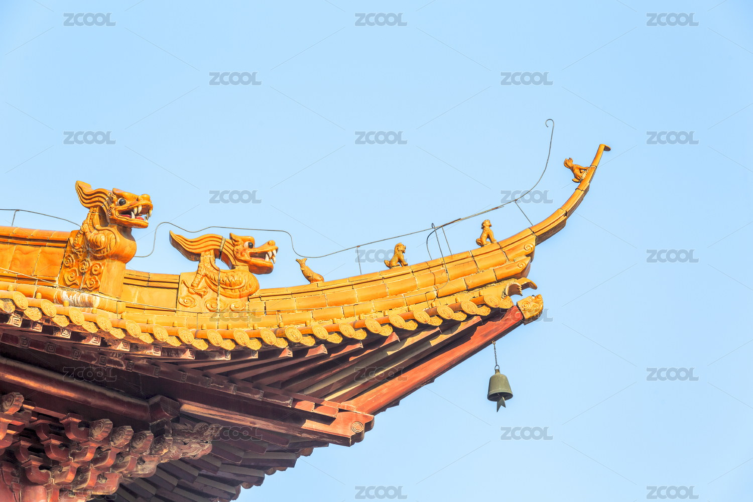 中国古寺庙建筑屋角飞檐琉璃瓦特写