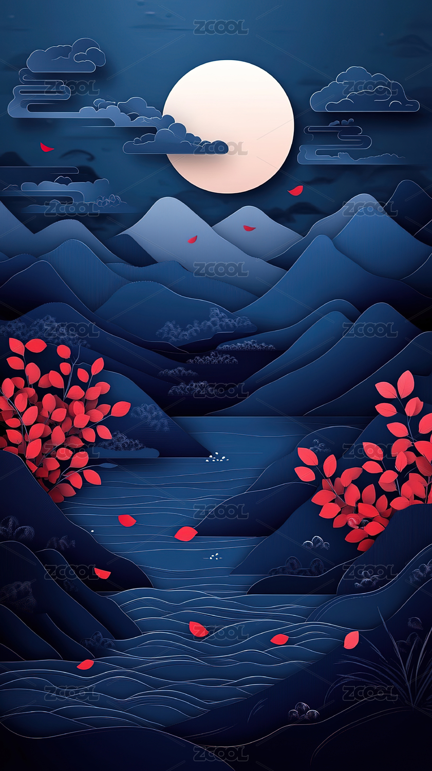 中秋节山水满月插画