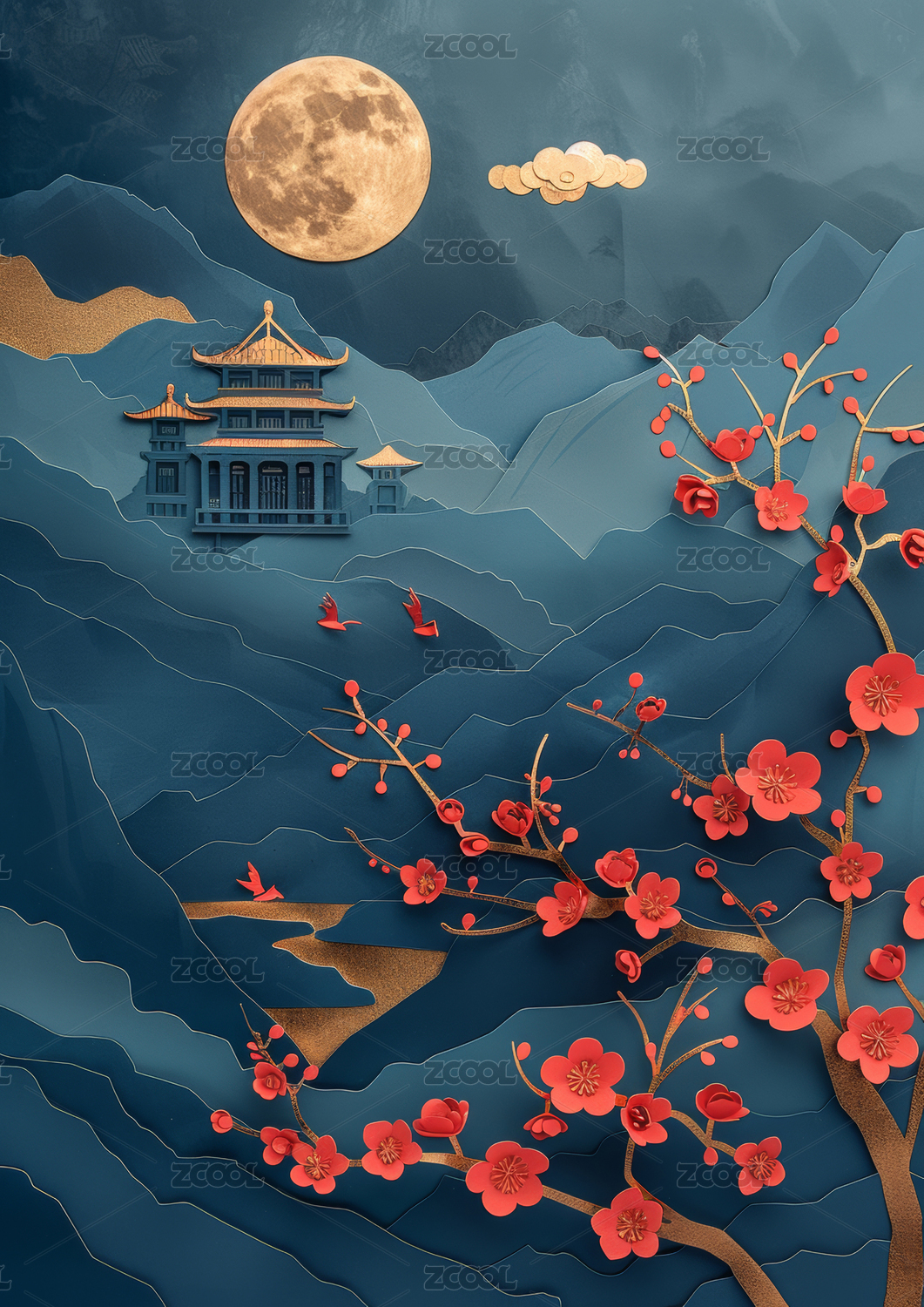 蓝金色中秋节圆月与楼阁风景插画