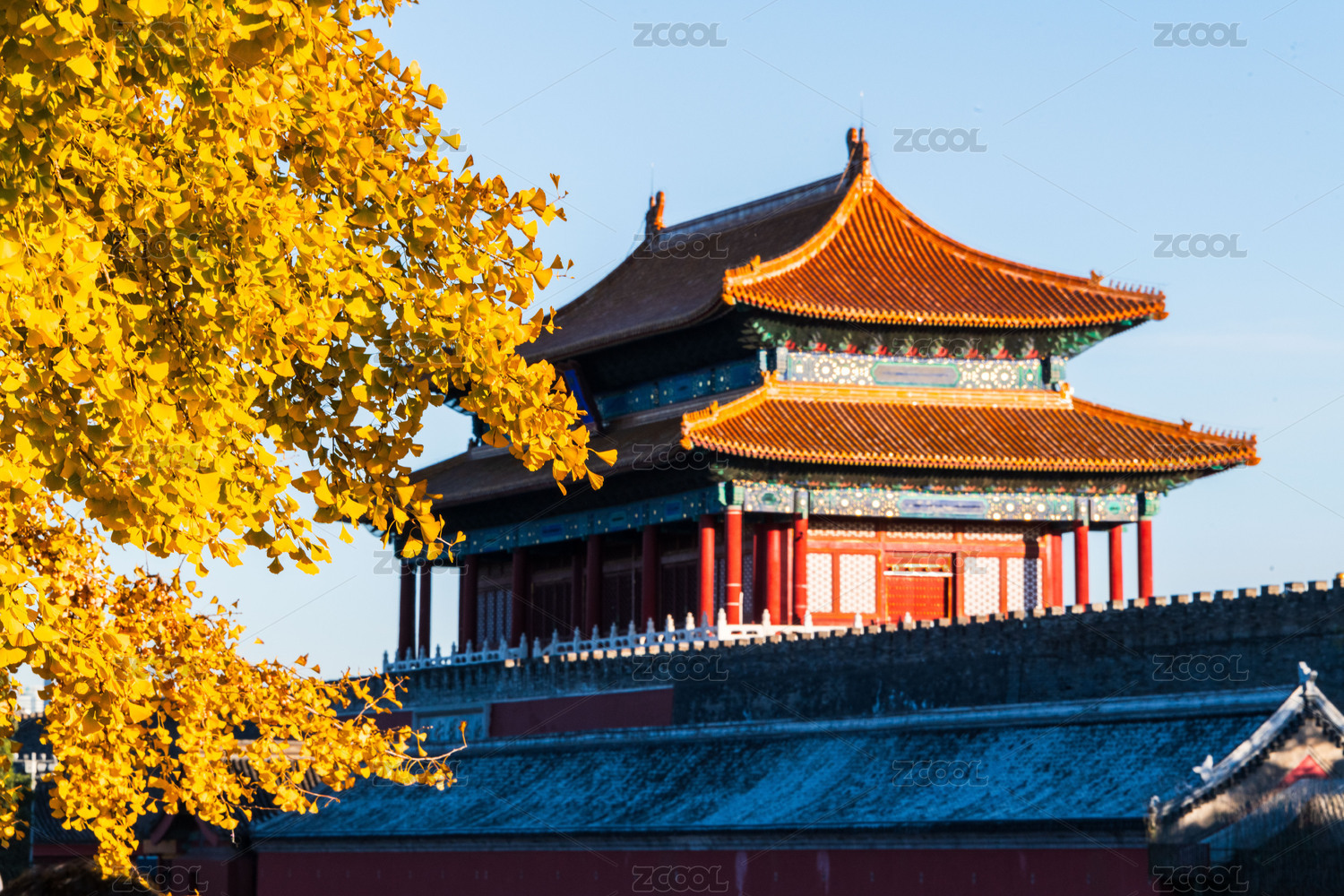 秋日阳光中金色银杏树叶掩映下的故宫角楼