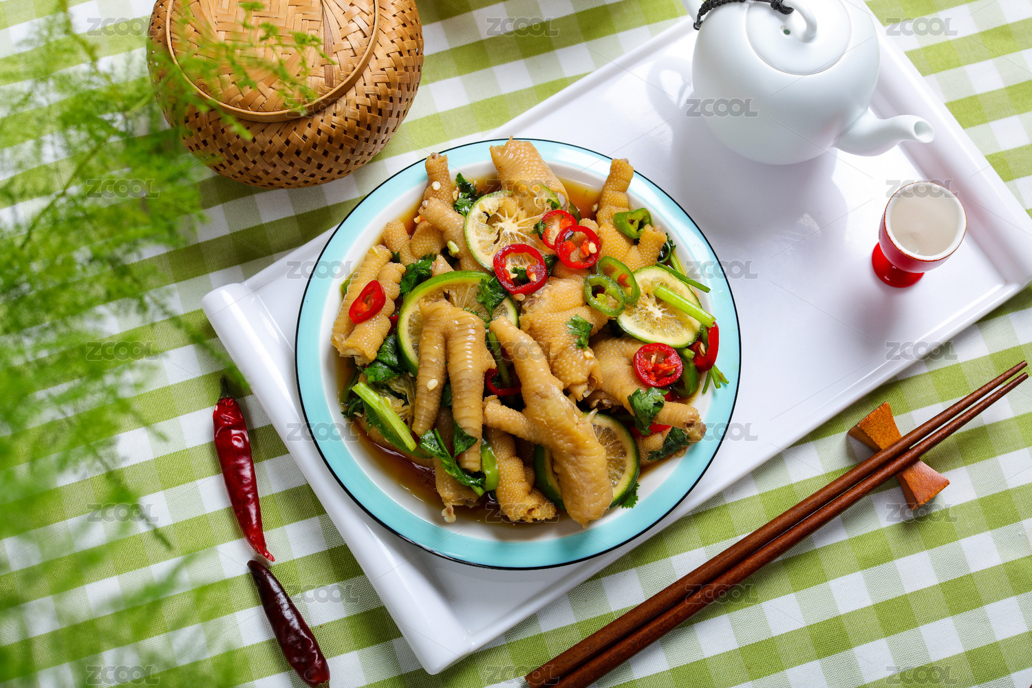 木盒里白碗里的柠檬泡椒凤爪