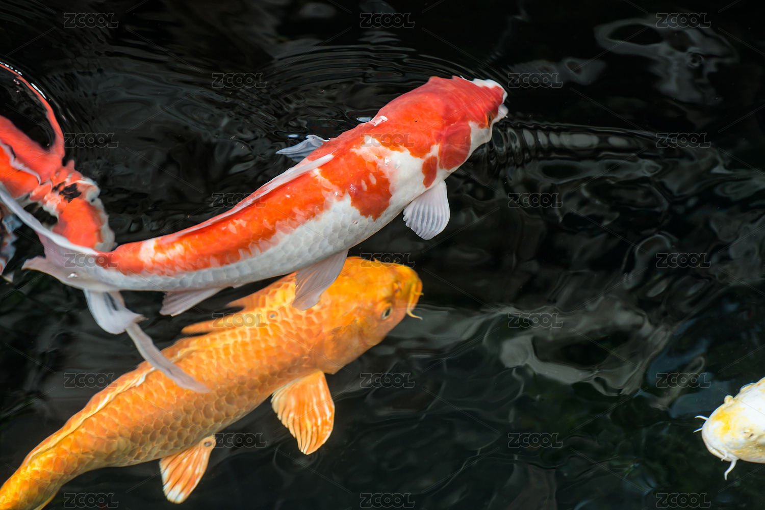 在夏季户外鱼池里游泳的红色观赏鱼——锦鲤