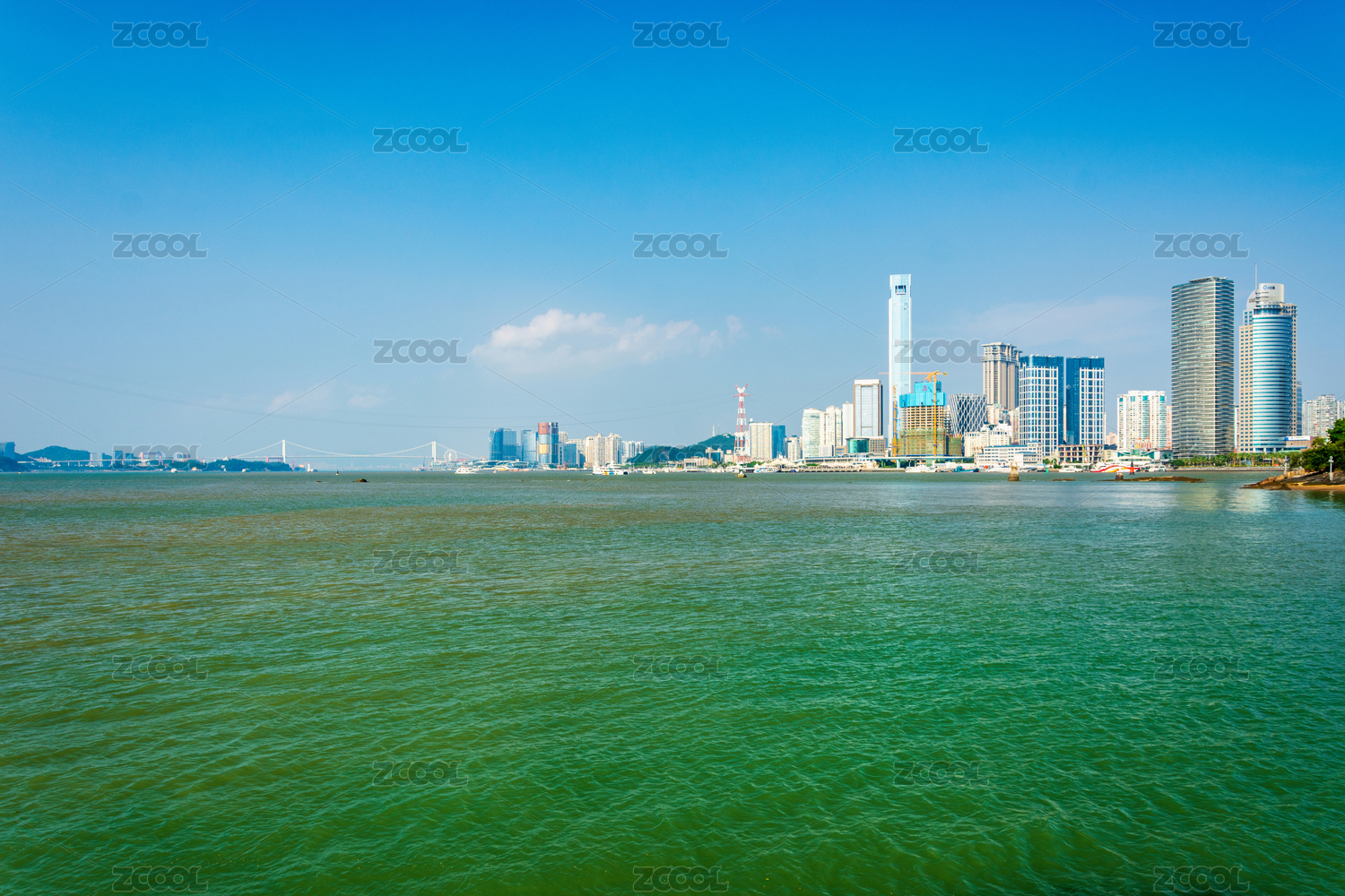 中国广东省珠海市沿海的现代城市建筑和海上交通贸易