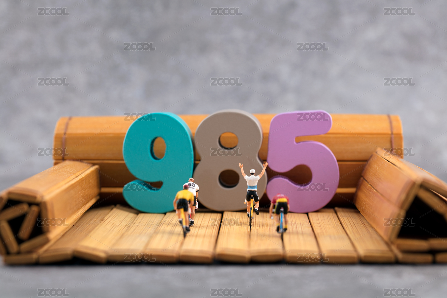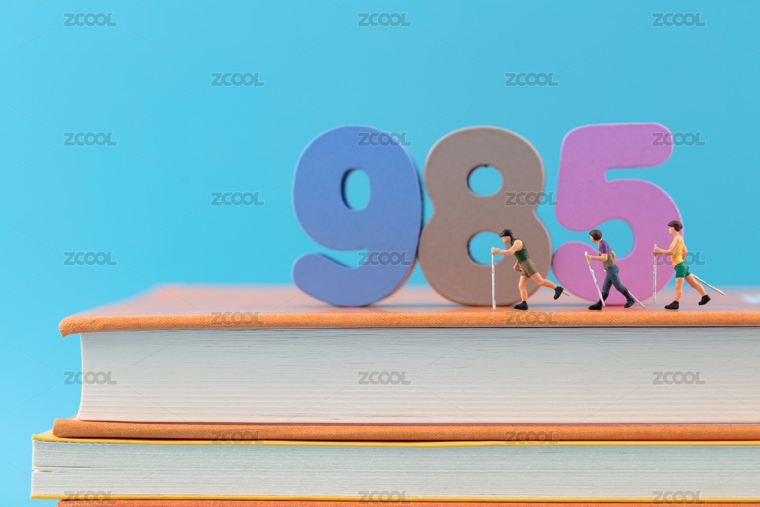 微缩创意书本上的彩色985数字与学生