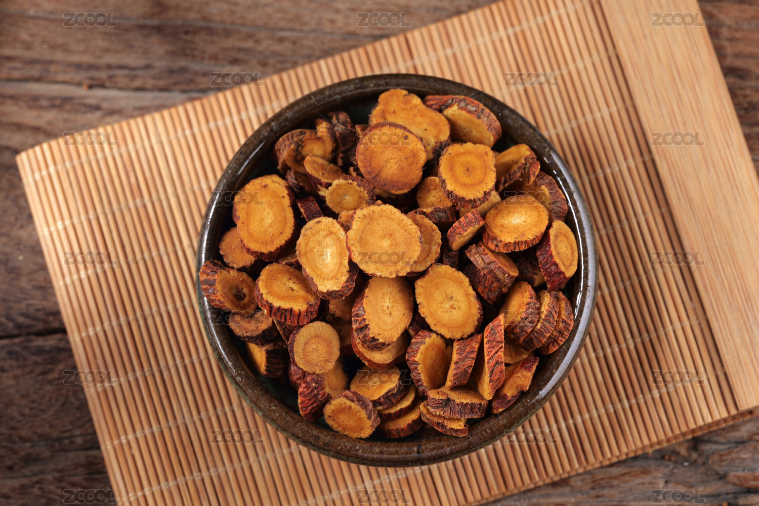 木桌上摆着一盘切成片的中药材甘草片