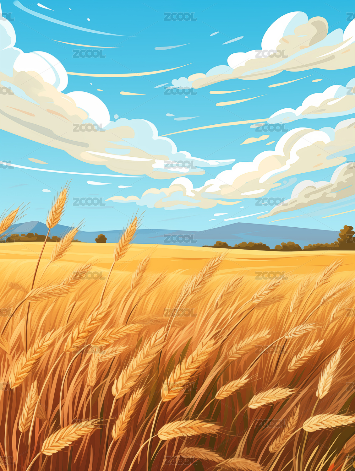 手绘卡通蓝色天空下的麦田插画