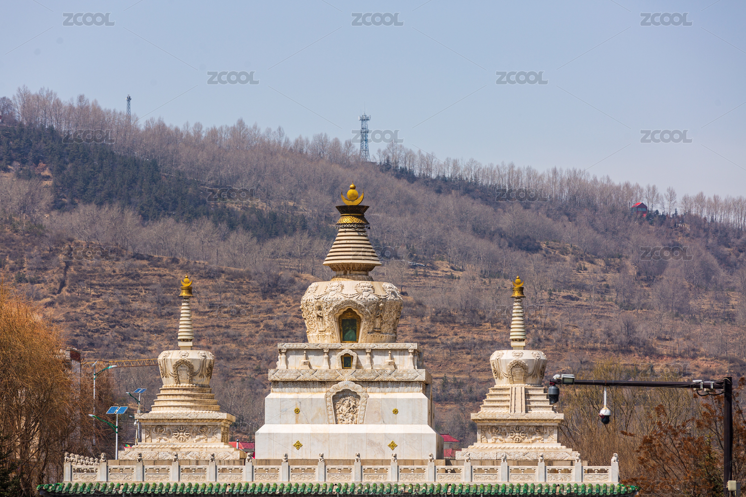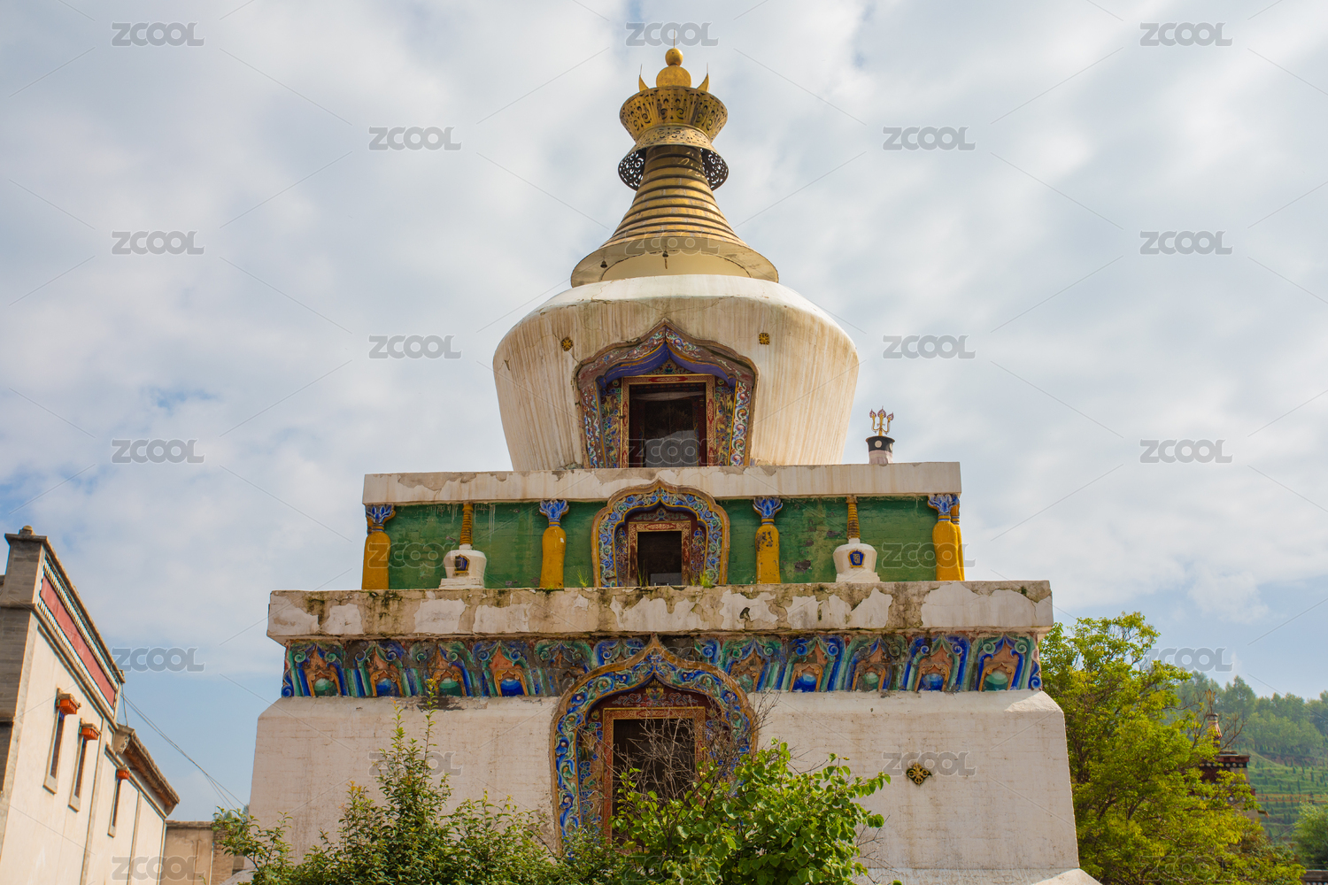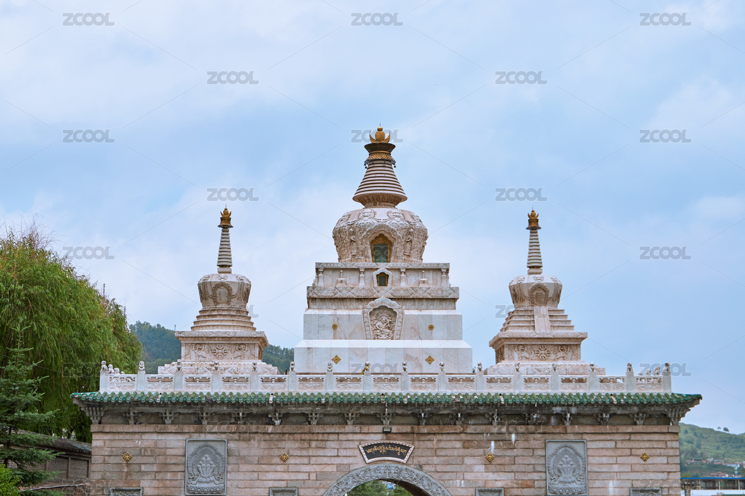 天空下青海省湟中塔尔寺入口处的的白色菩提塔