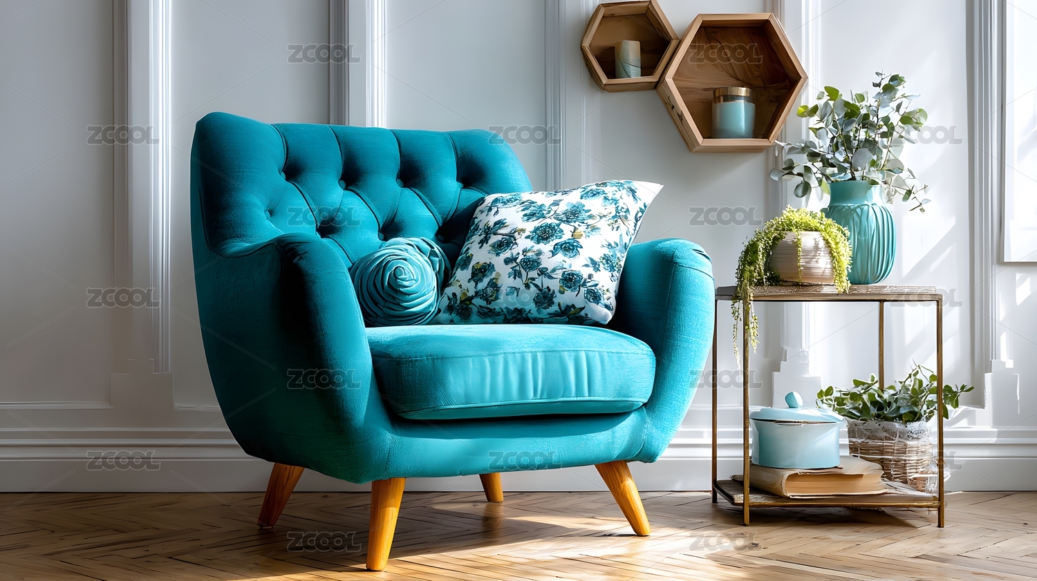 蓝绿色丝绒沙发室内摆放,温馨舒适