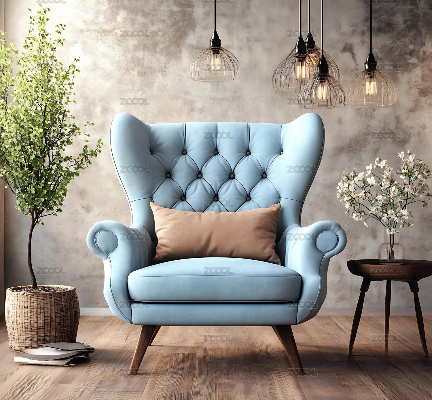 椅子,沙发,蓝色,绒面,金属腿,地毯,灰色,墙壁,花瓶,干花