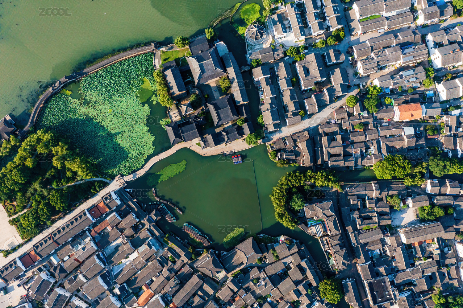 宁波东钱湖韩岭老街日落晚霞航拍景色