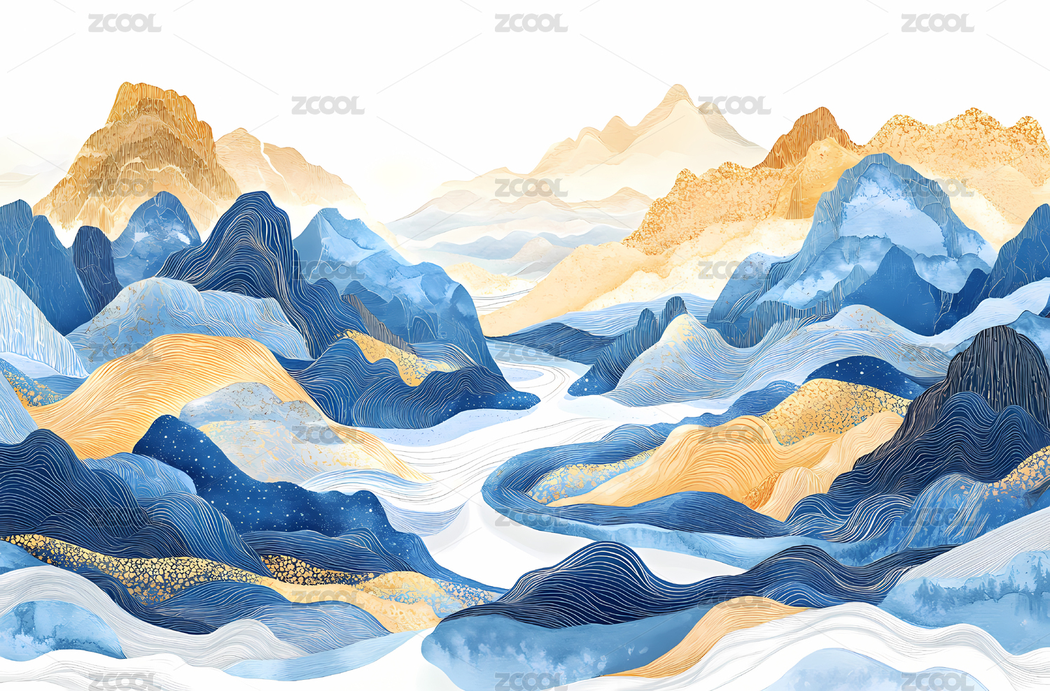 风景,中国,古代,绘画,金色,线条,蓝色,水,假山,绘图