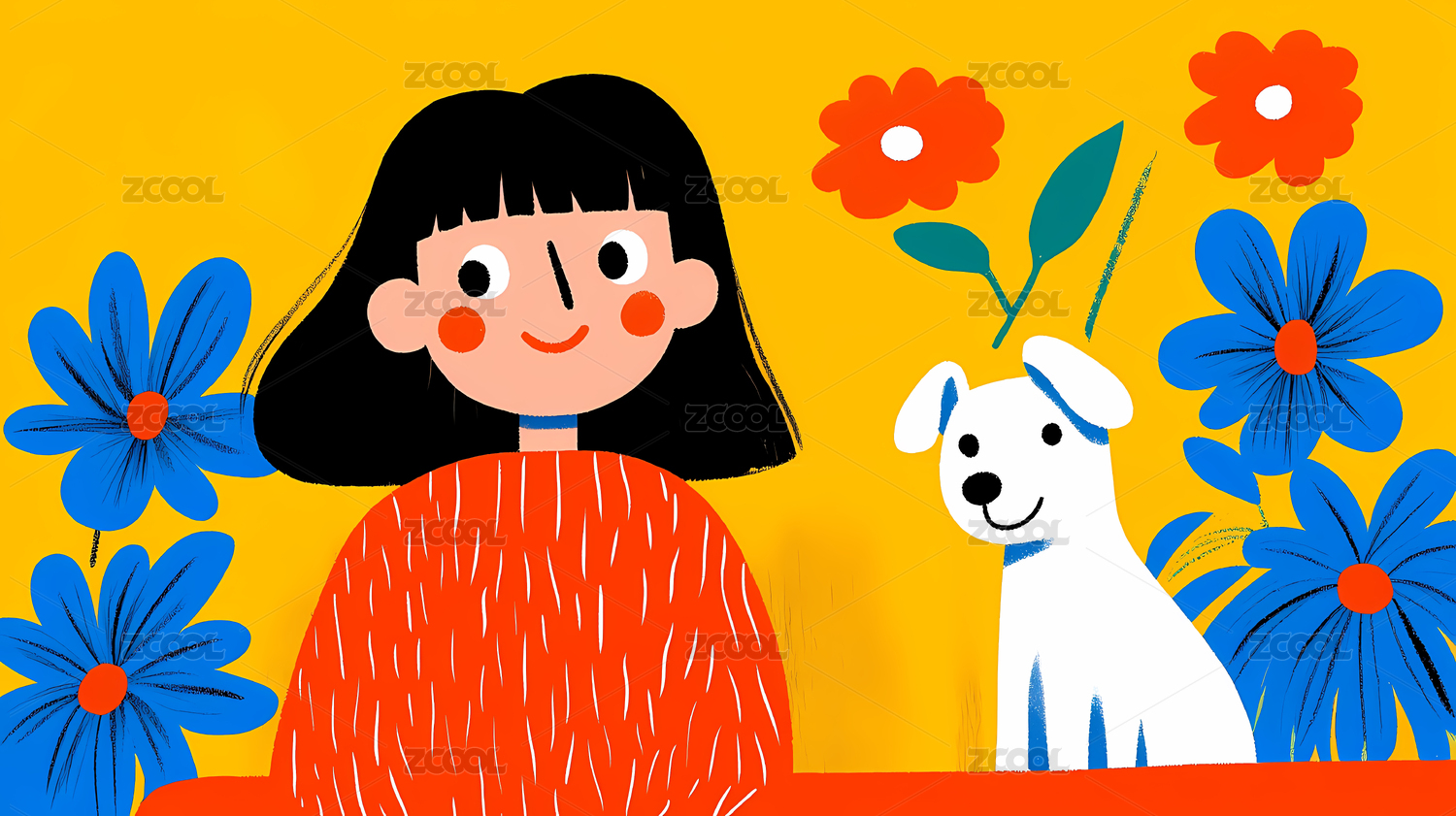 小女孩和小狗在草地上玩耍 手绘矢量插画