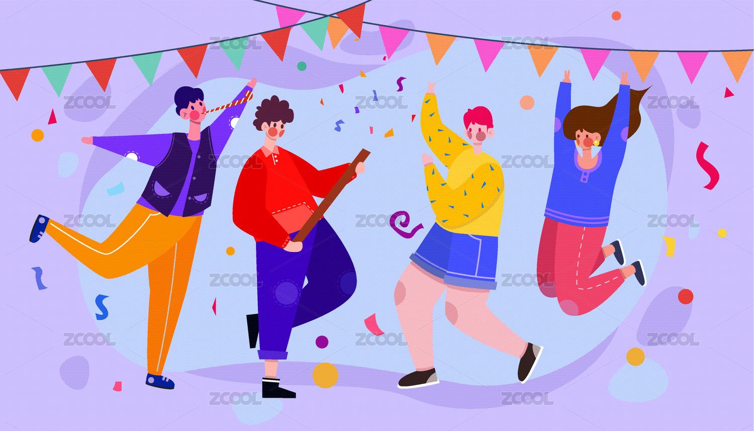 男女青年挥舞彩旗开心地庆祝新年的插画