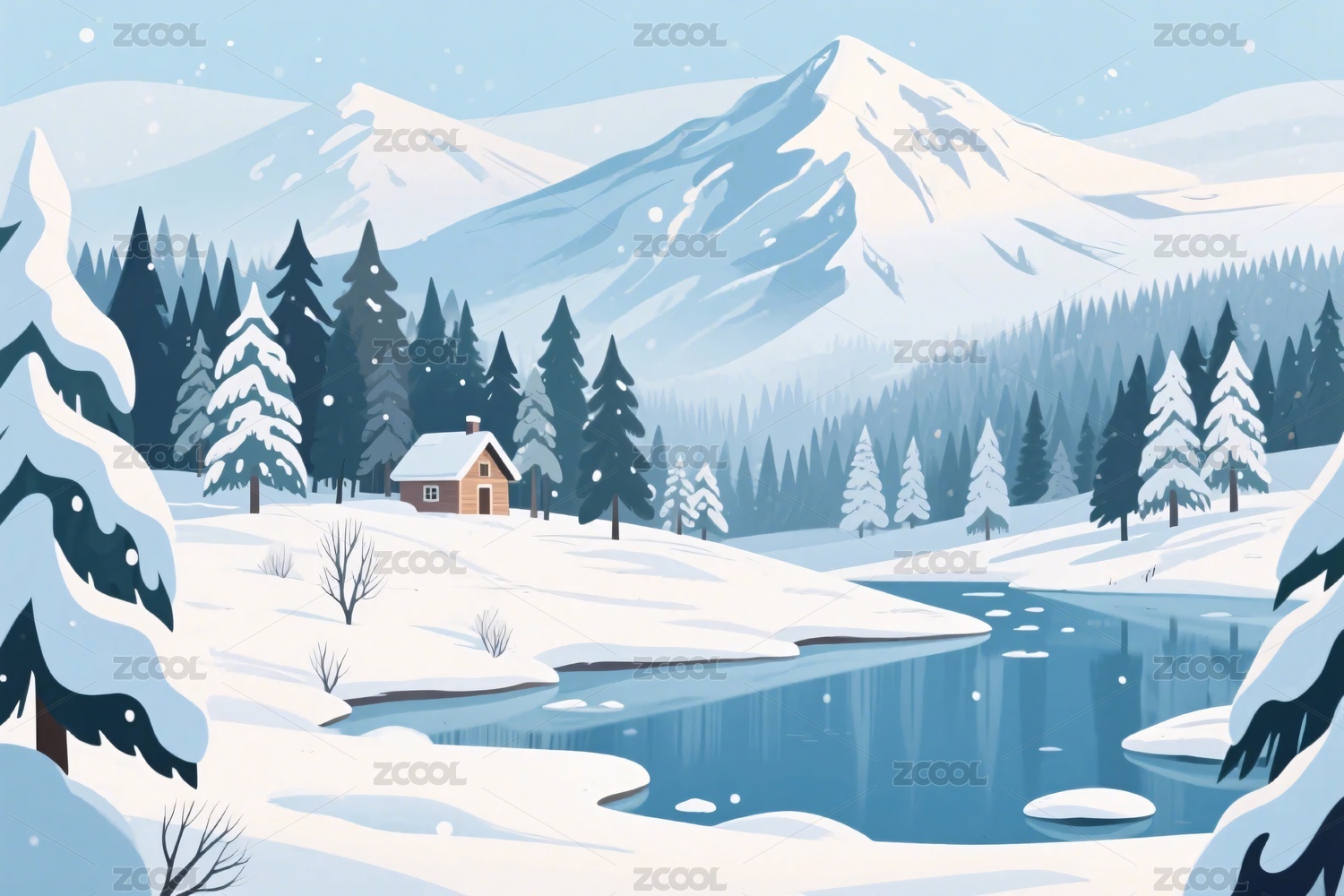 冬天冬日雪景小木屋村庄森林场景卡通插画