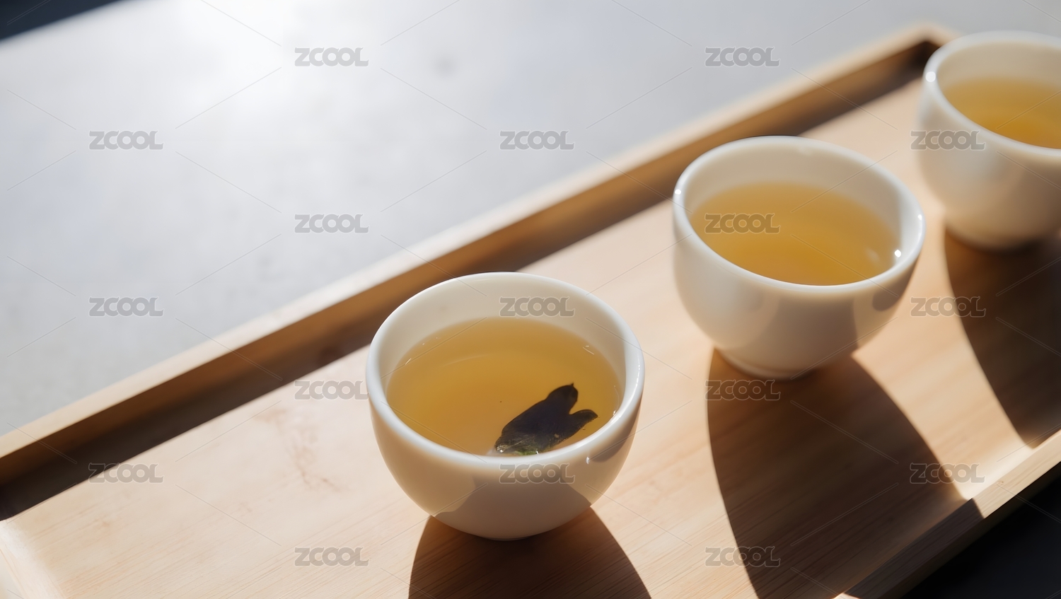 阳光下的茶杯与木质托盘